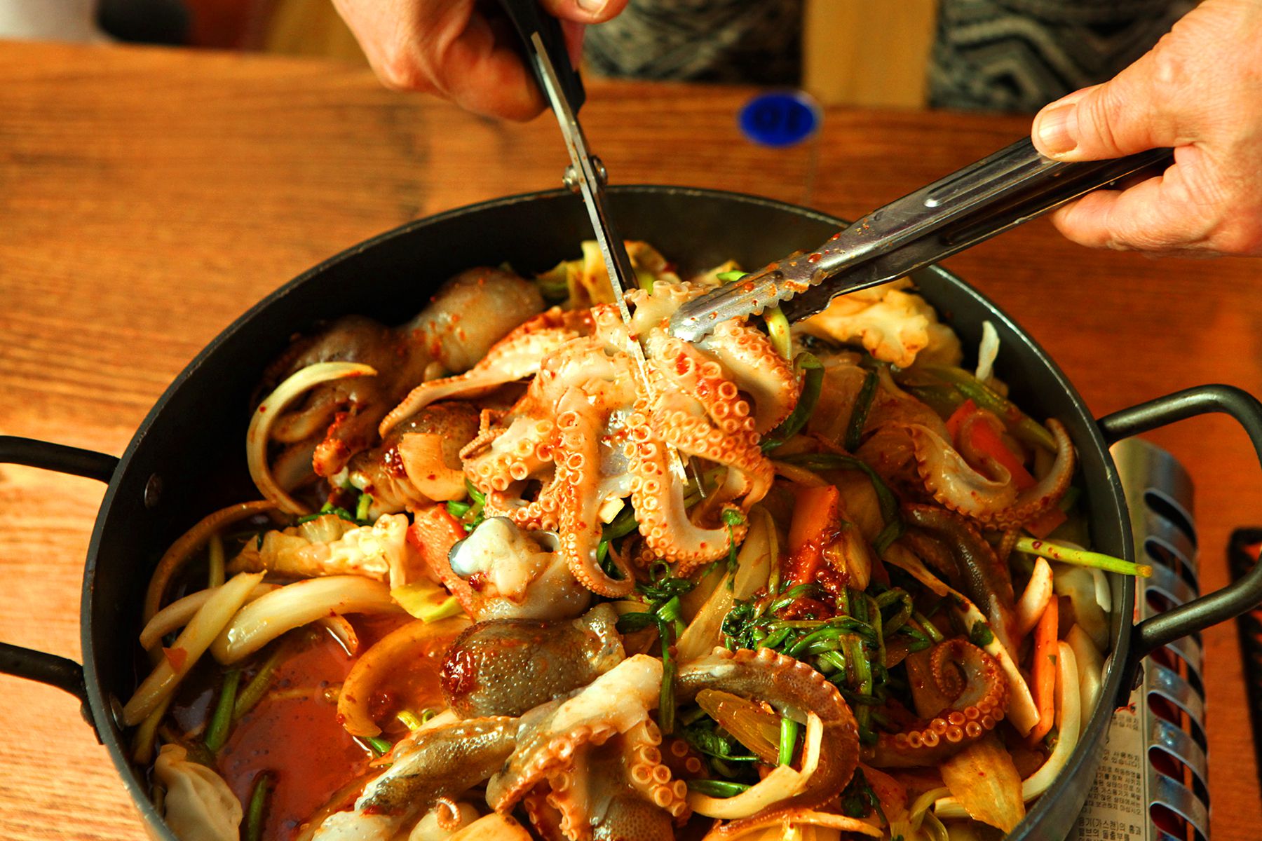 입맛을 자극하는 매콤한 양념과 낙지, 신선한채소들과 함께 볶아먹는 낙지철판요리입니다.