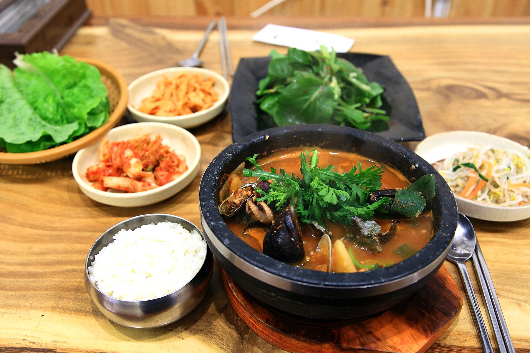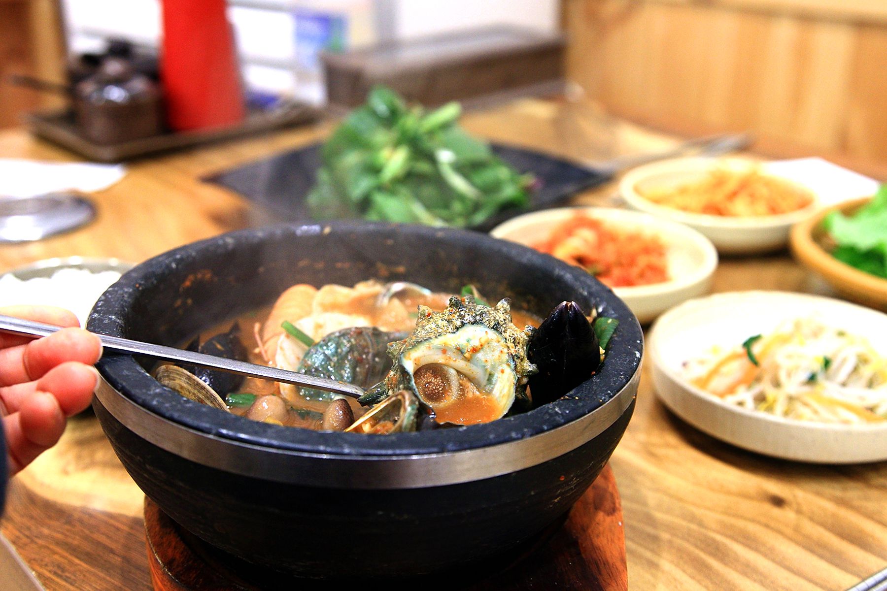 전복, 뿔소라, 딱새우, 가리비, 홍합, 모시조개등 신선한 해산물들이 가득한 해물뚝배기는