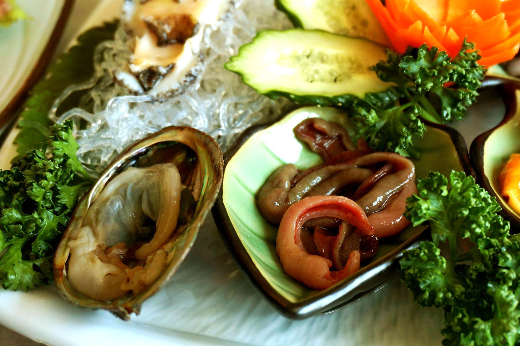 흑깨죽,샐러드, 낙지,문어,해삼, 먹게 ,소라,전복,김치, 단호박조림,오징어 무침
