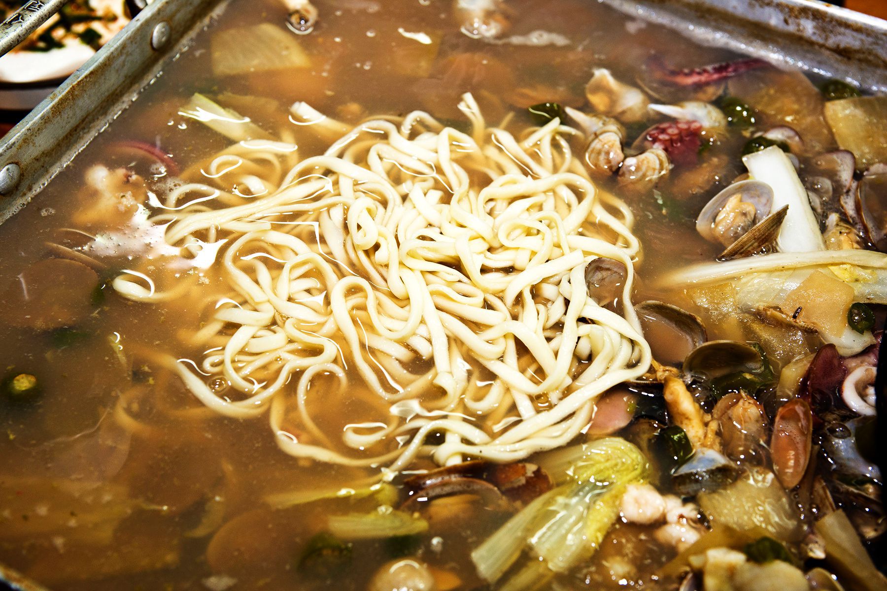 해산물을 건져 먹고 나서 육수에 칼국수사리를 넣어먹으면 이것 또한 조개전골을 맛있게 먹는 방법 중 하나랍니다.