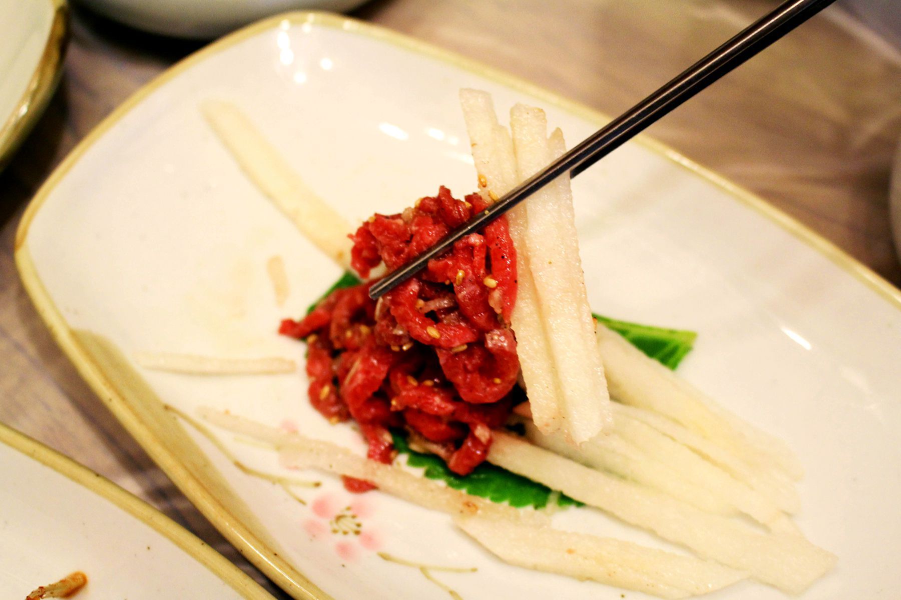 A코스의 특징에는 육회가 포함되어 있다는 것입니다. 싱싱하지 않으면 팔수 없다는 육회, 그리고 생선회