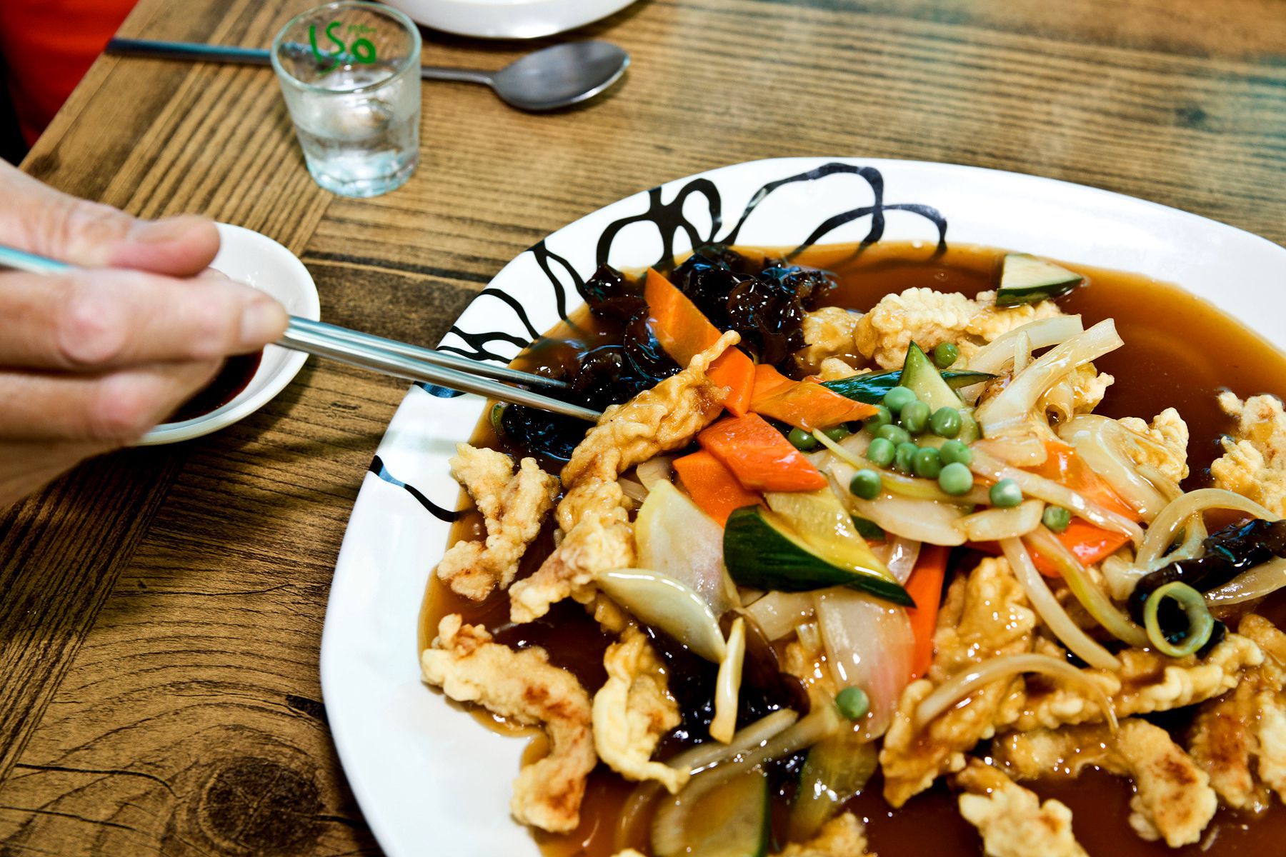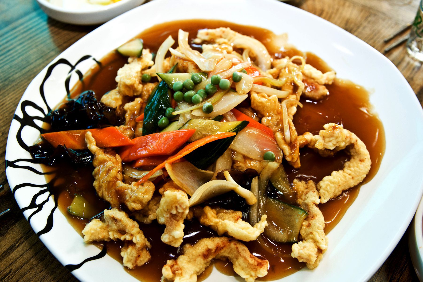 바삭한 튀김에 야채와 곁들인 달콤하고 깔끔한 소스를 부어 먹으면