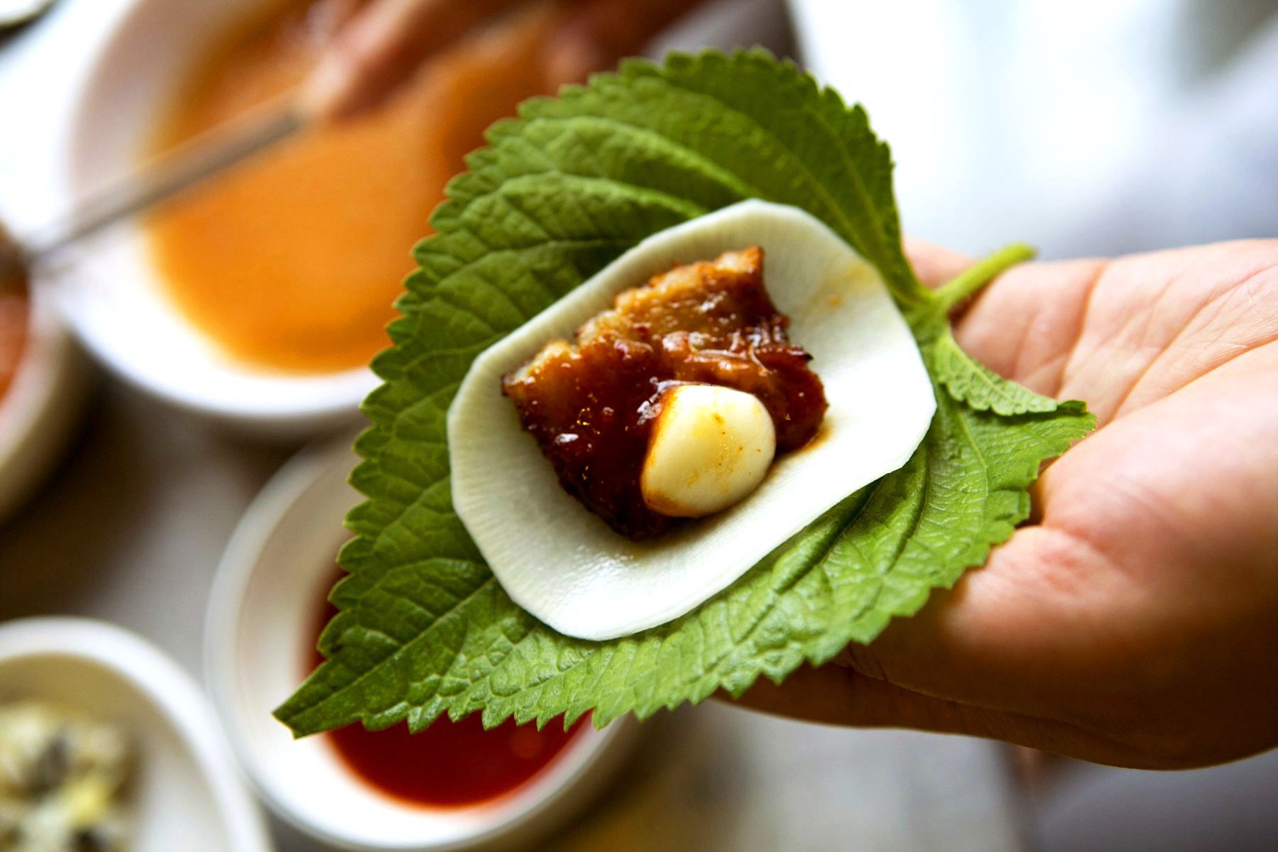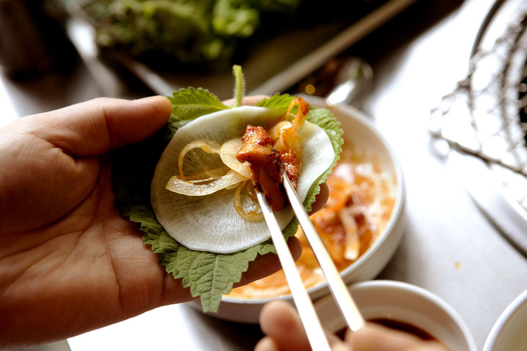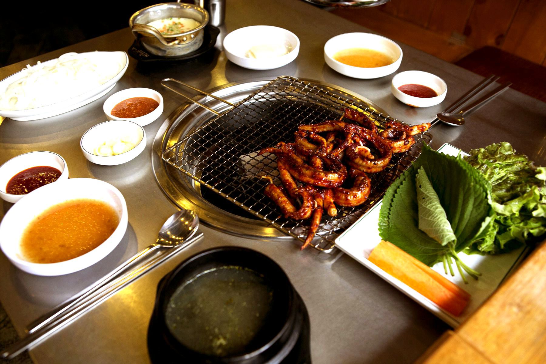 소스찍어 깻잎에 싸먹으면 깻잎향과 함께 쫄깃쫄깃한 꼼장어의 식감이 예술이죠.