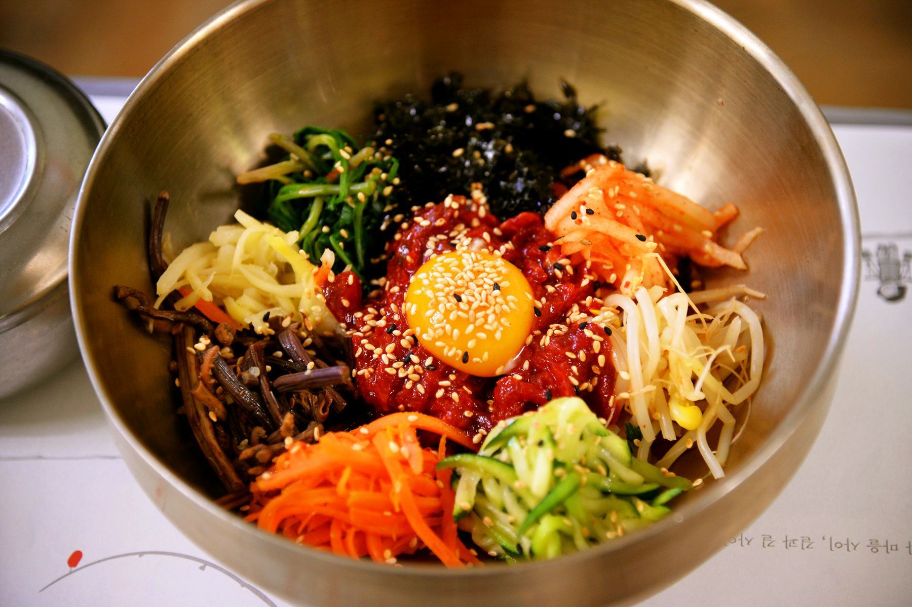 각종 야채들과 1등급이상의 한우와의 만남으로 이루어진 윤기가 자르르 흐르는 육회 비빔밥!