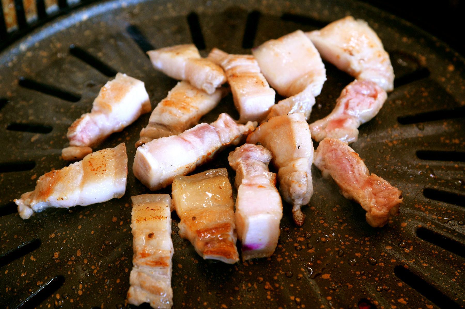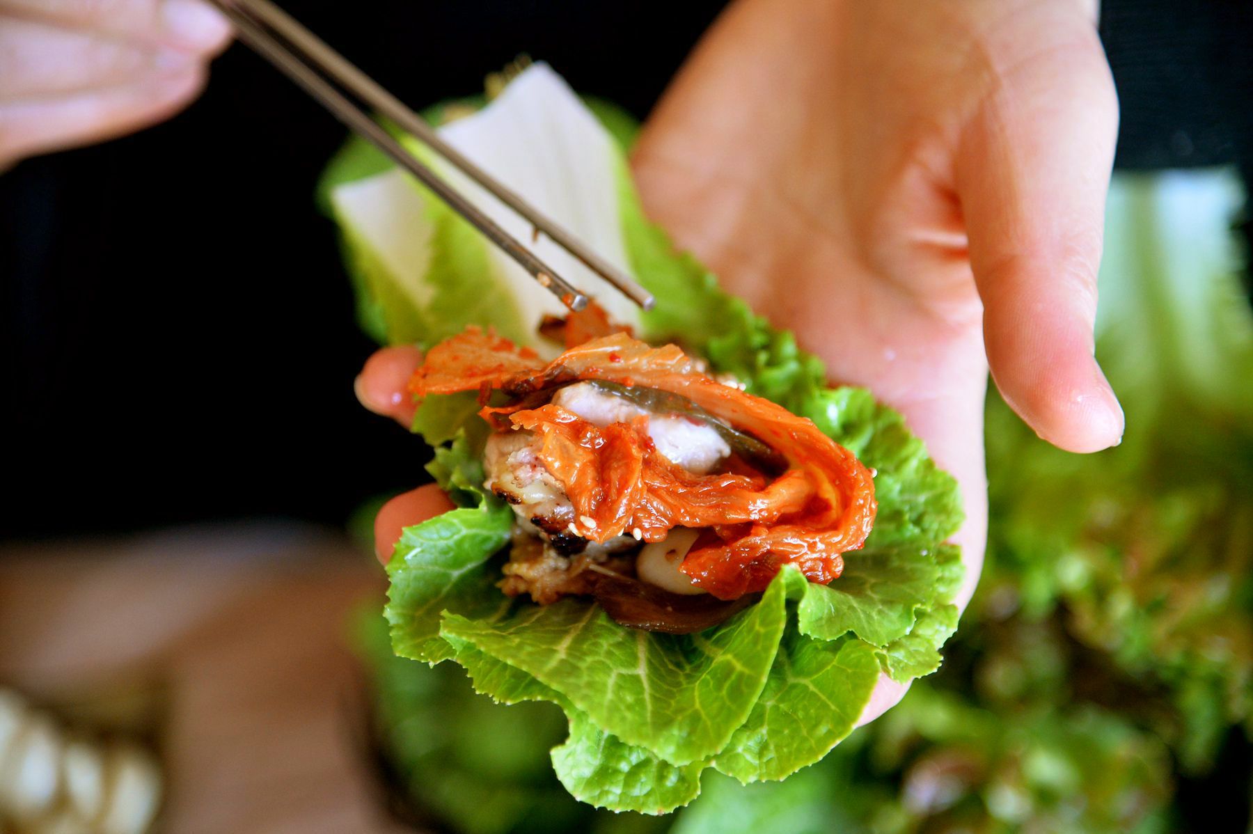 잘 구어진 고기 한점과 묵은지를 함께 넣고 쌈을 싸서 드시면