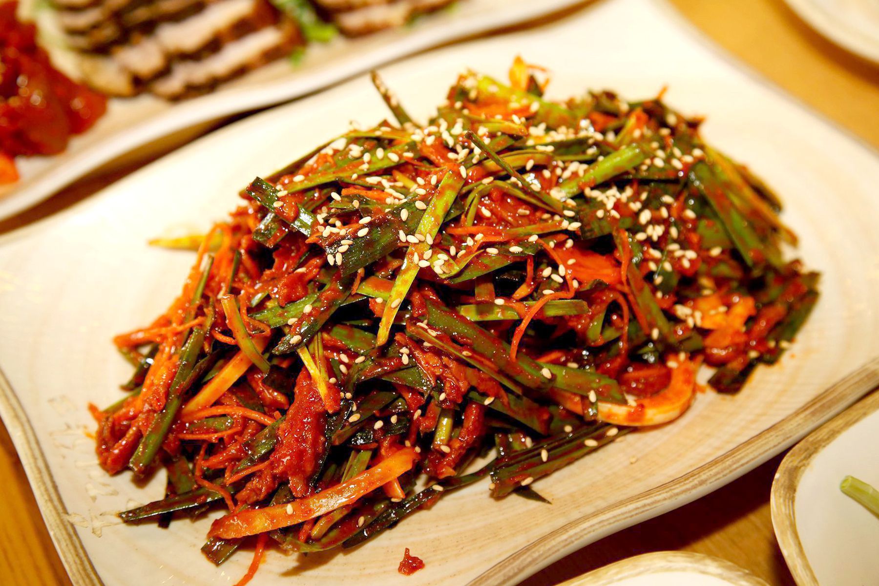 소고기 양지와 신선하 부추를 육대장만의 특별한 양념으로 새콤달콤하게 무쳐낸 것으로