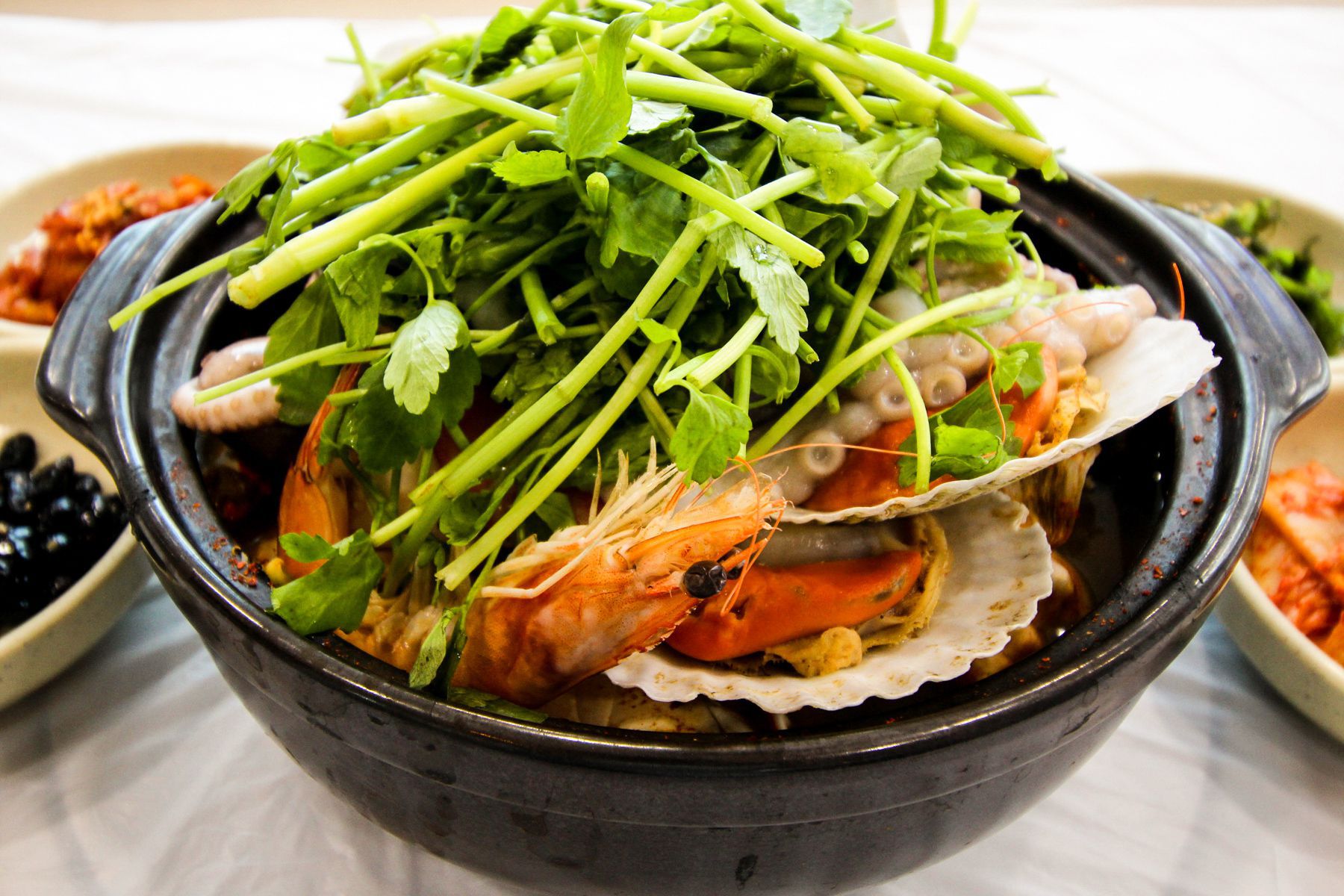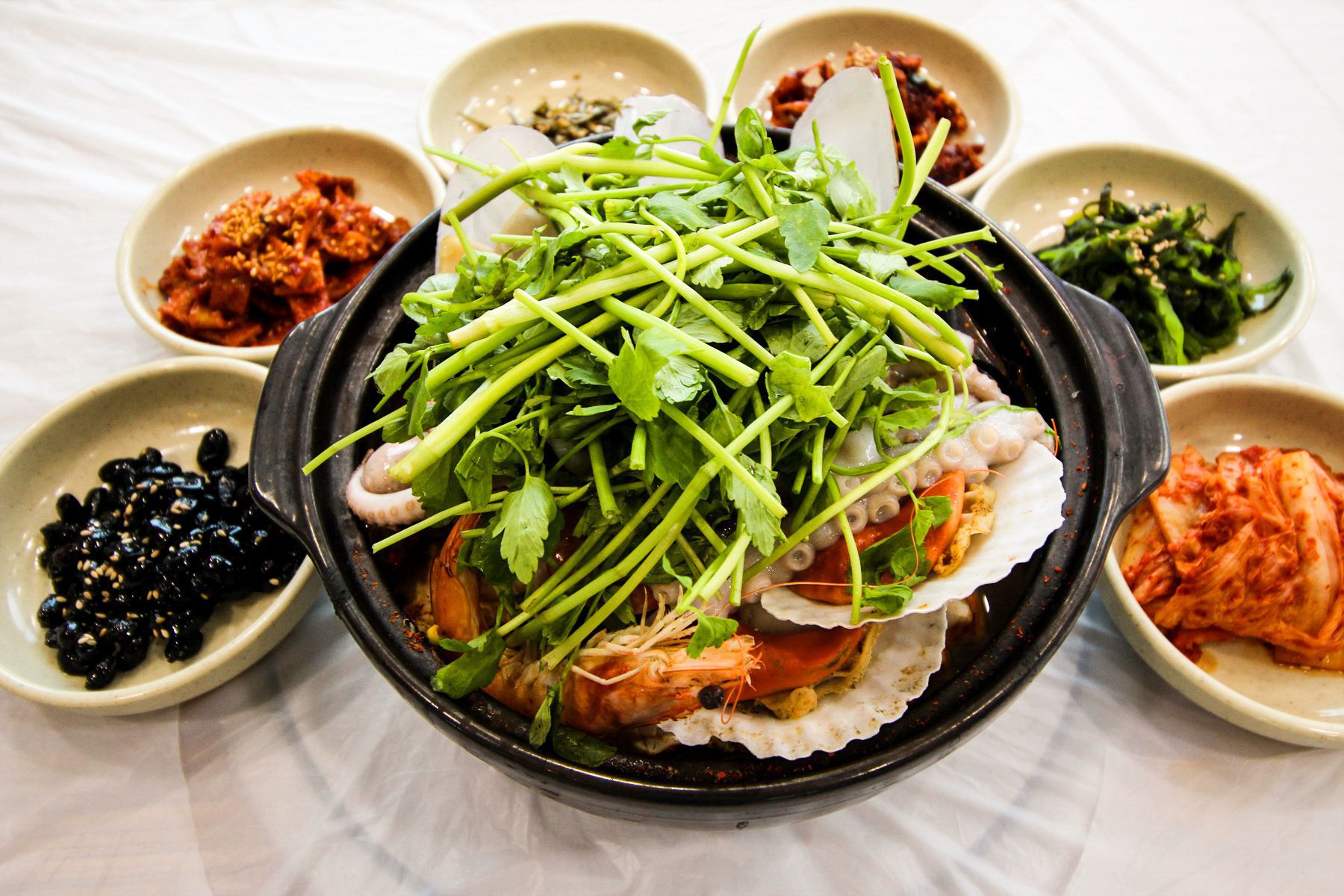 미나리향이 가득한 해물 뚝배기랑 다양한 밑반찬과 함께 먹으면