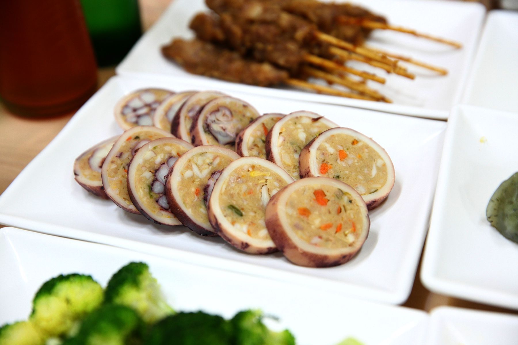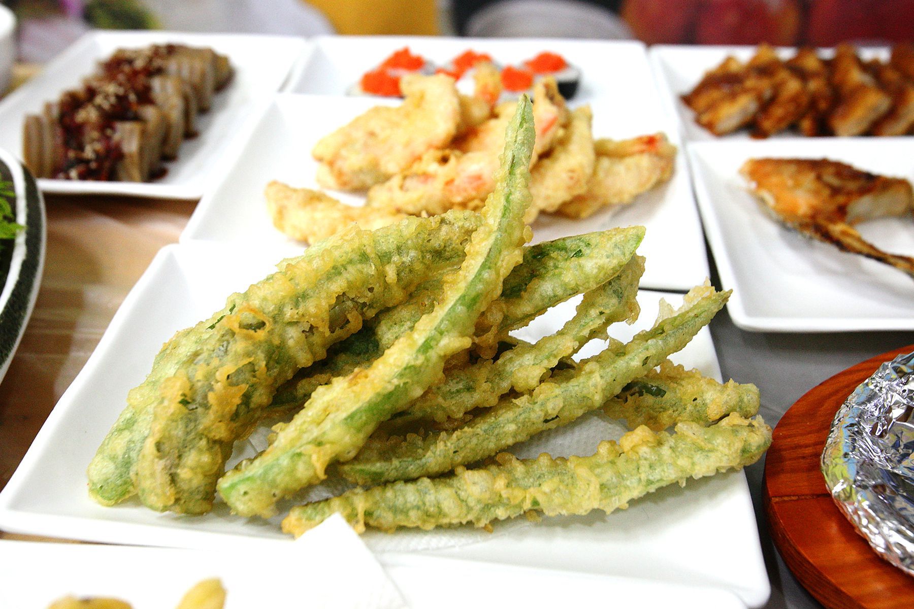 오징어순대, 싱싱한 해물스끼다시, 전복죽, 닭꼬치, 튀김등등