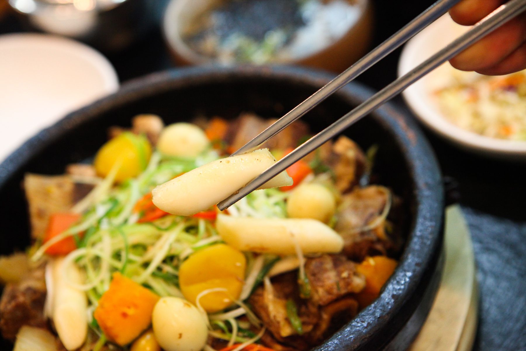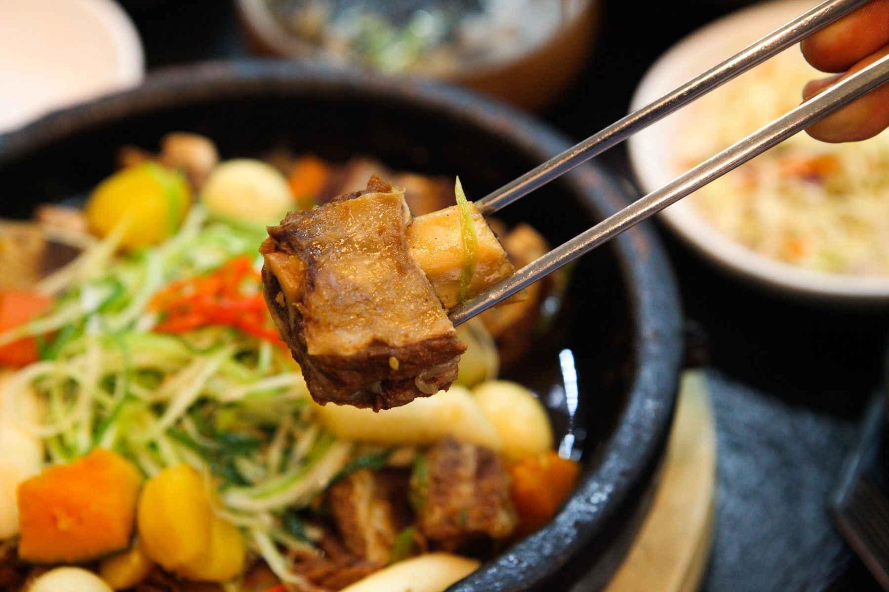 야들야들하게 익은 고기는 갈빗대에서 부드럽게 빠지고 단호박, 새송이버섯, 떡, 당근, 밤, 메추리알등