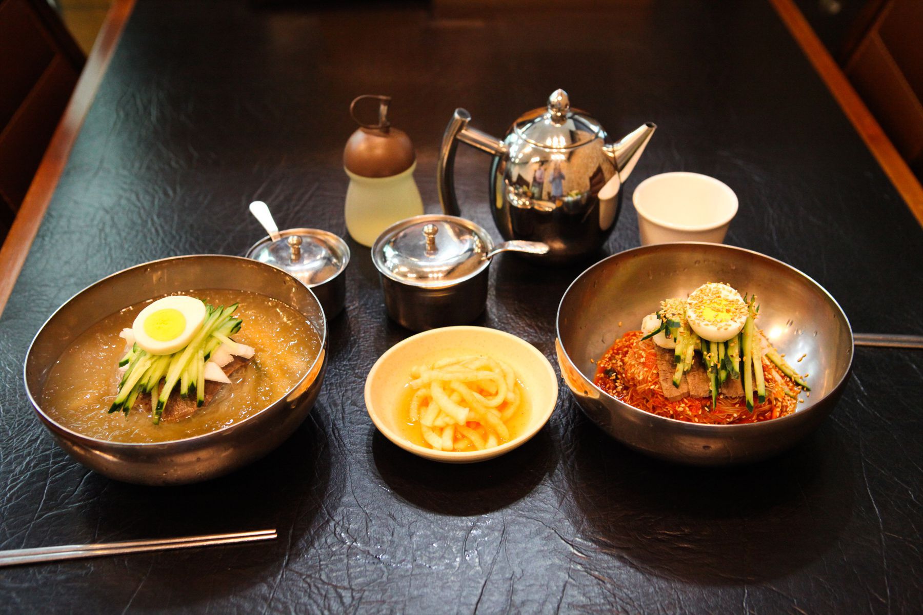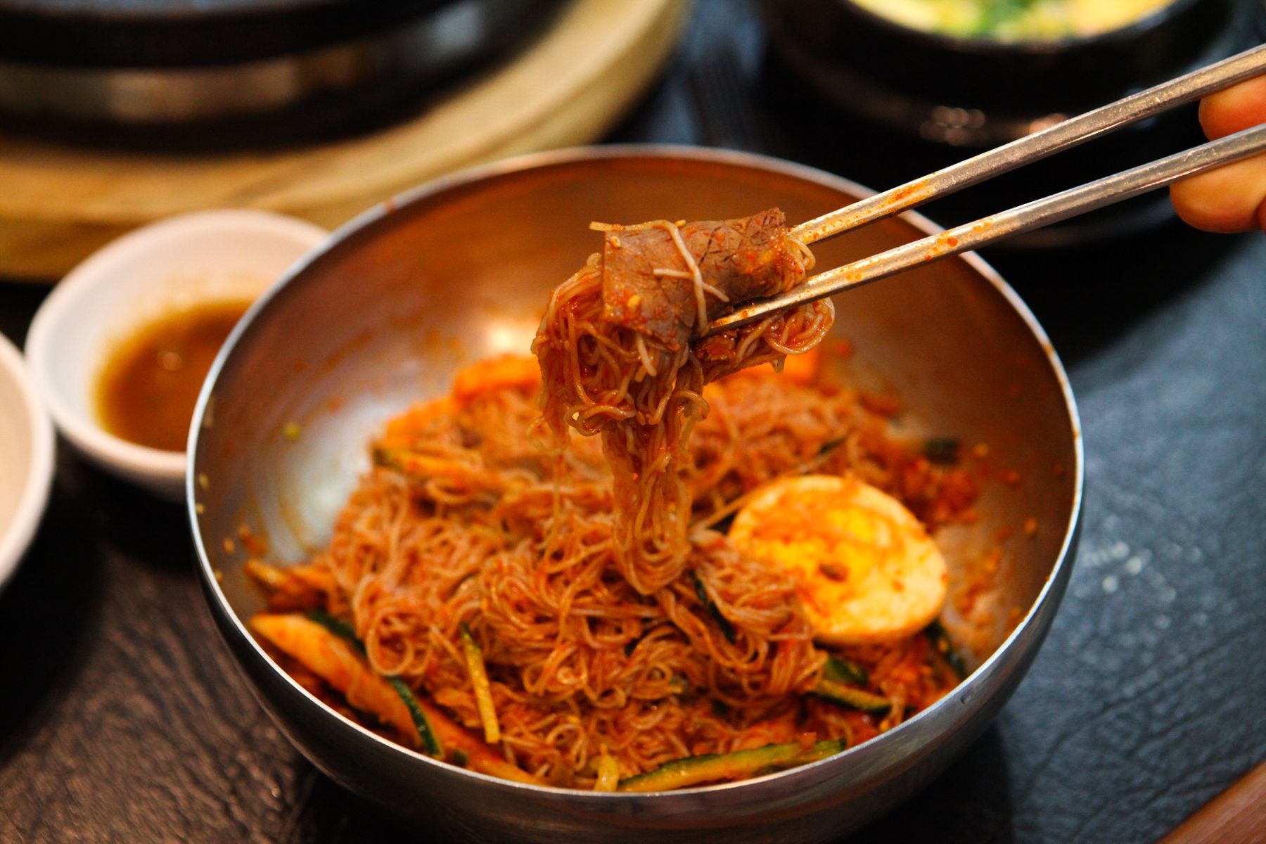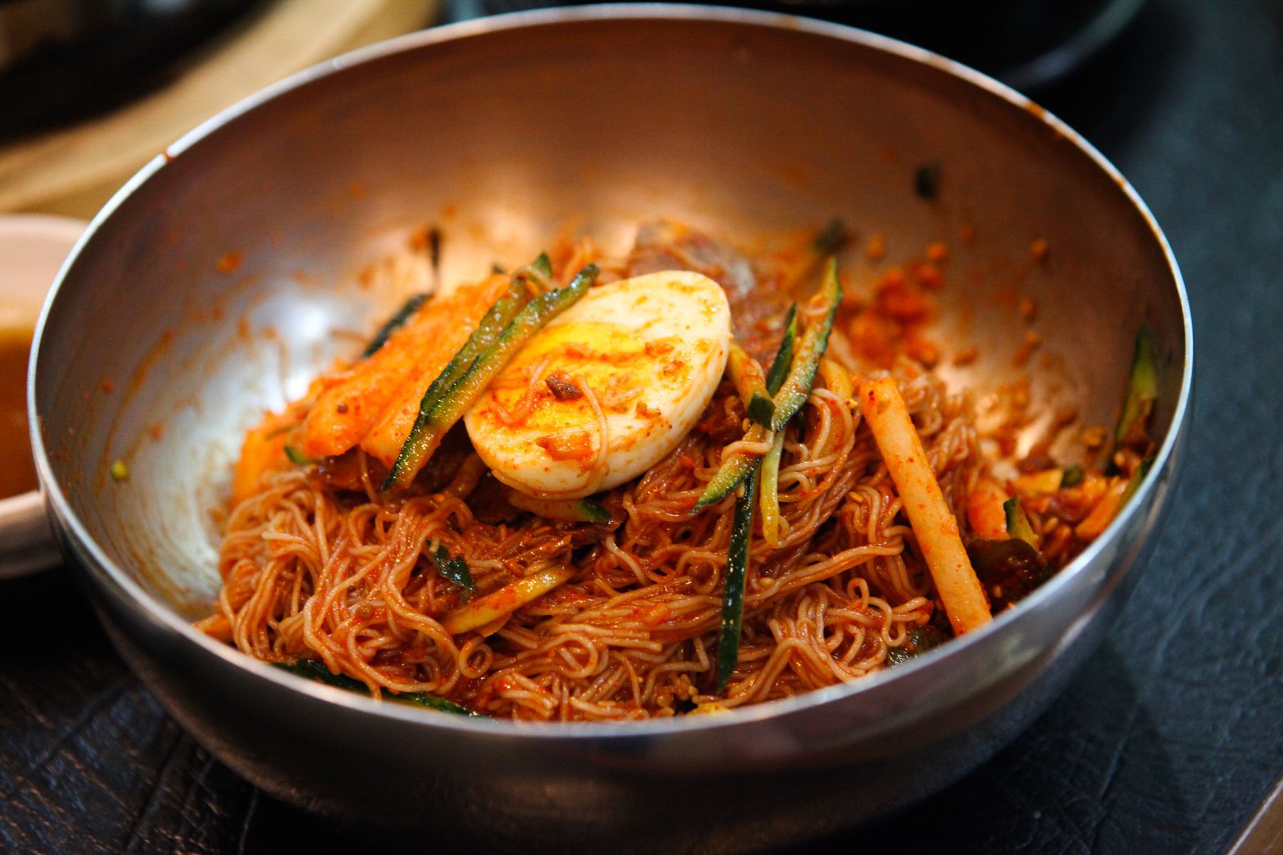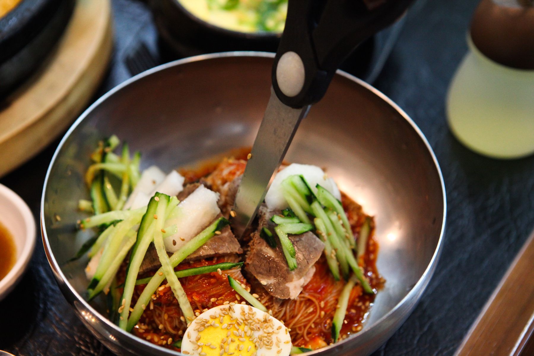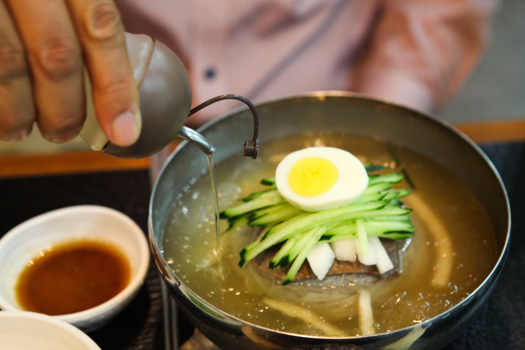 기호에 맞게 식초과 양념장을 넣어 입맛에 맞춰 고명으로 올려진 무와, 오이, 고기와 함께 먹는