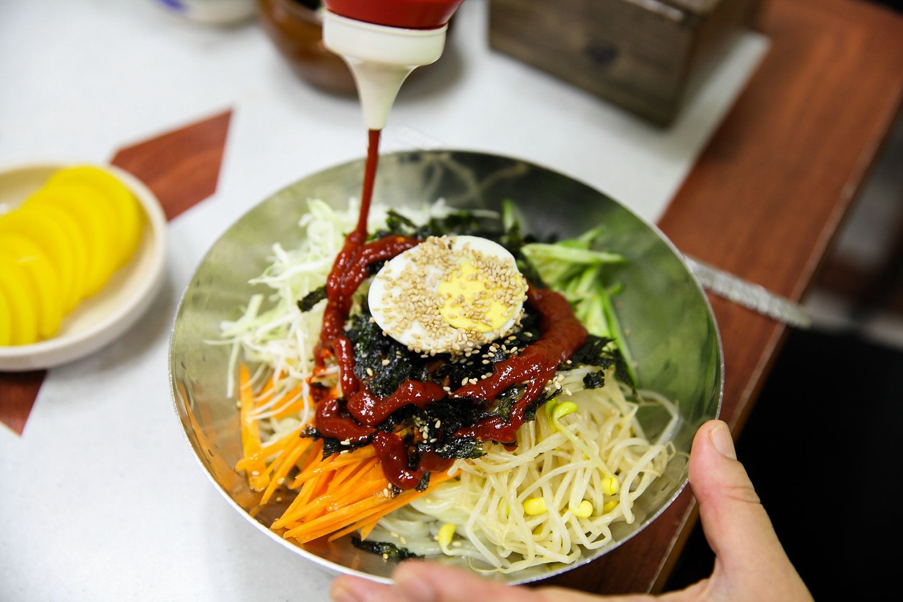 쫄면은 소스가 뿌려져서 나오지 않는답니다.