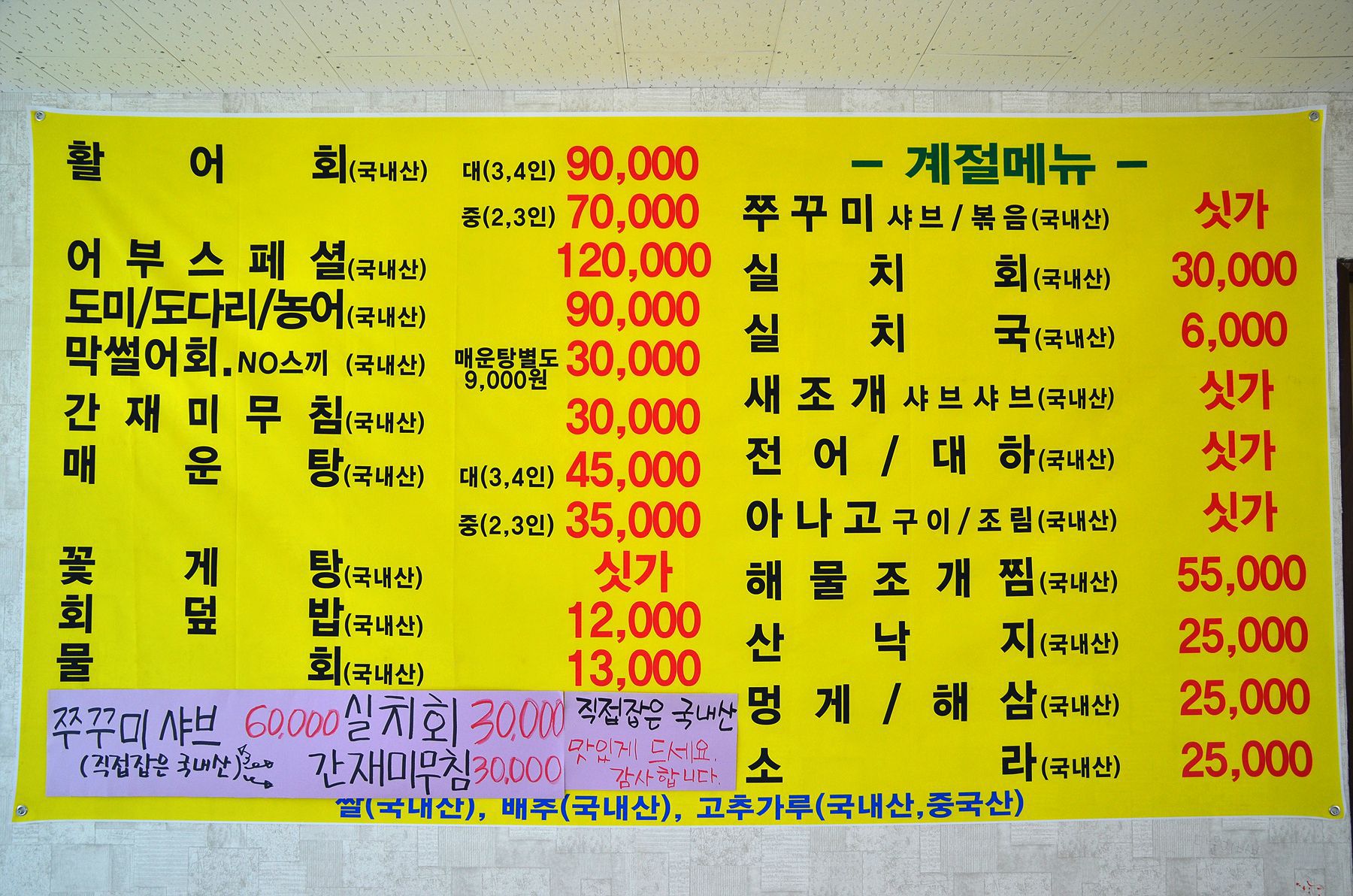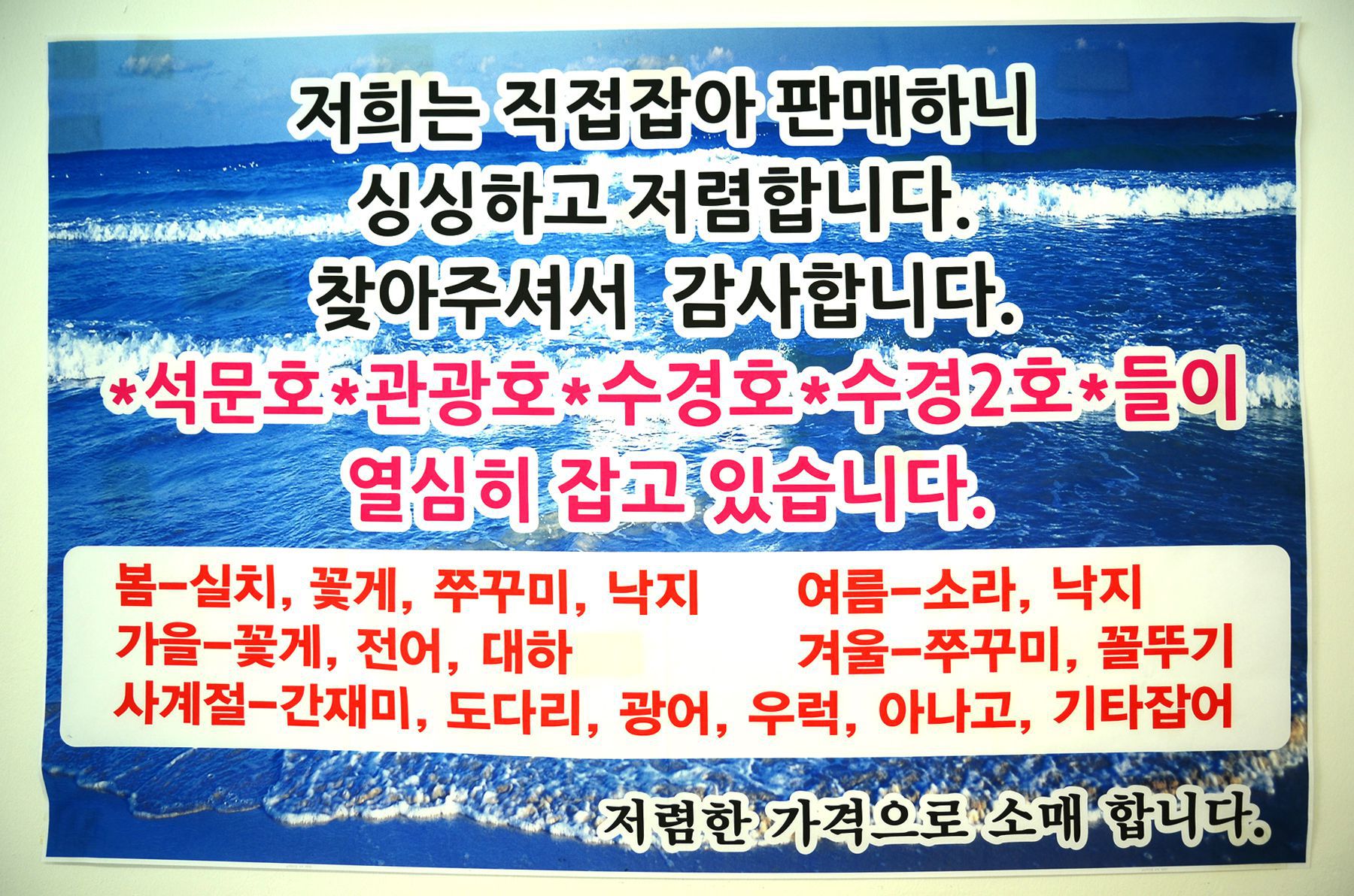 직접 잡아 판매하시는 다양한 어종들이 수족관 가득 그 몸값을 자랑하고 있습니다.