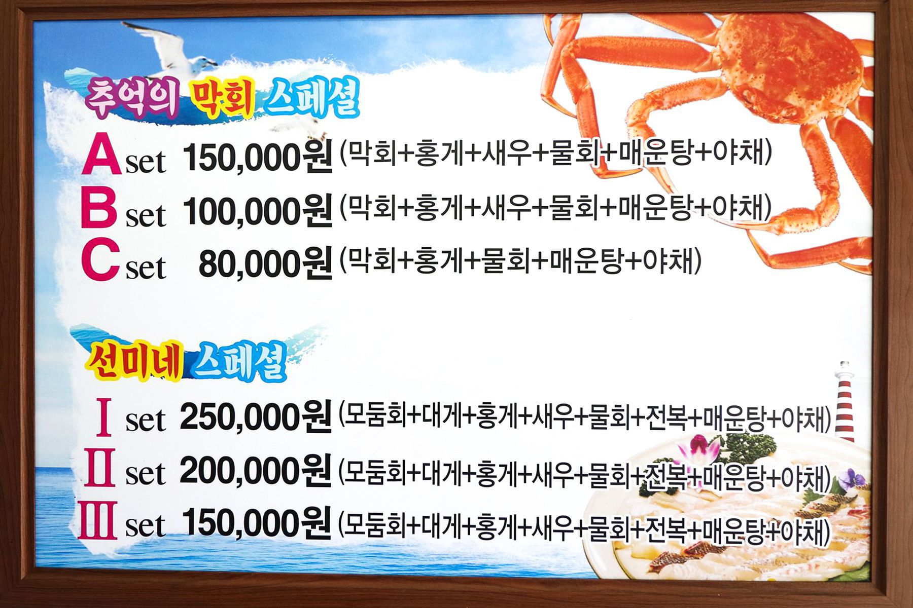 신선한 회와 게,전방대게,새우,물회,전복을 한번에 맛볼 수 있는 메뉴이며