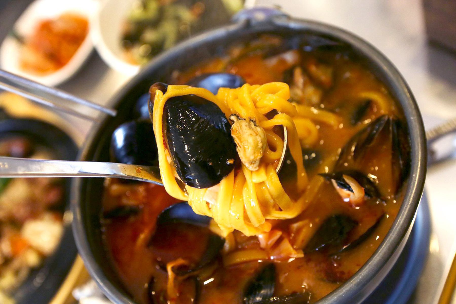 맑은 또는 얼큰 홍합짬뽕, 모듬쏘세지, 매콤 메밀전병, 곤드레 나물전병과
