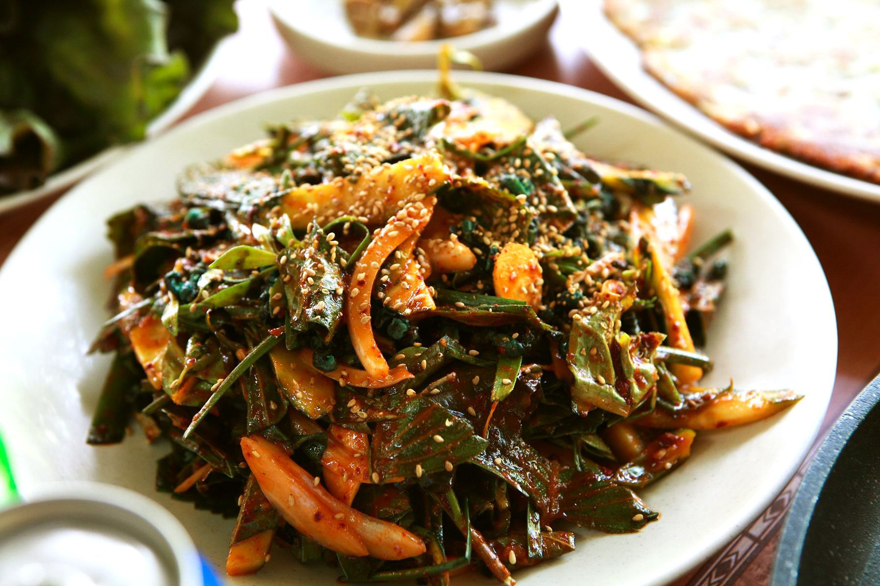 각종 나물과 마늘 쫑, 깻잎순, 민들레로 다양한 반찬들과 짱아치를 만들고, 특히 짜지 않은 맛에 중점을 두어 아삭하고 본연의 향을 느낄 수 있도록만들고 있습니다.