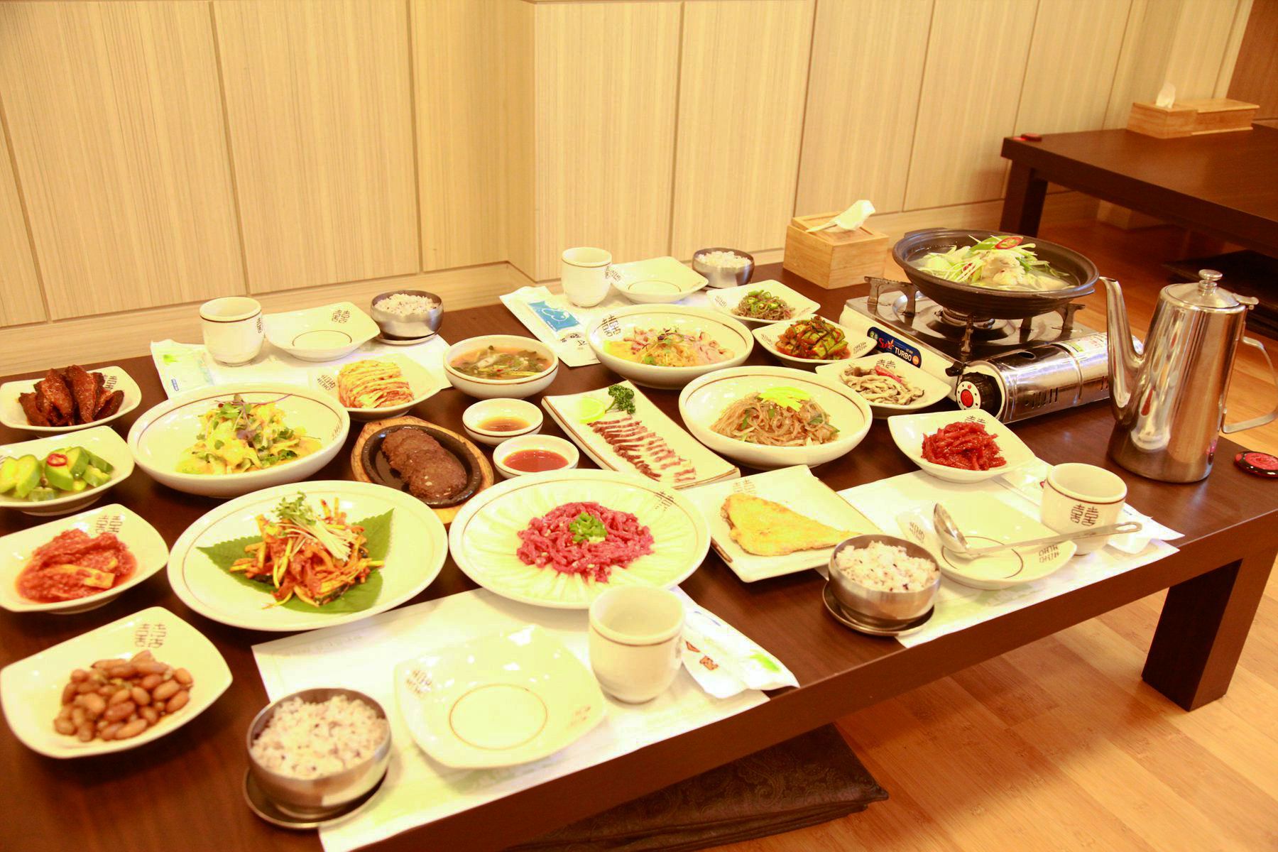 야채샐러드,매실오리훈제냉채,우엉잡채,떡갈비,육회,돌문어숙회,대구탕등 푸짐한 한상을 드실 수 있습니다.