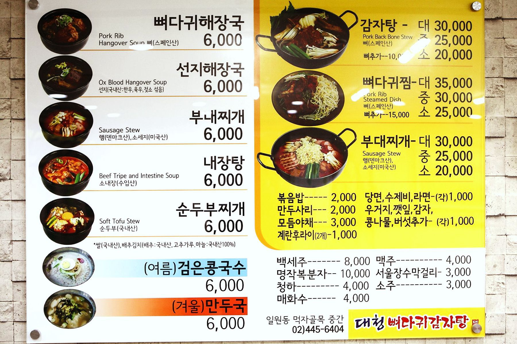 대표메뉴인 감자탕과 해장국 뿐만아니라 순두부찌개,부대찌개,뼈다귀찜등도 있으며 여름,겨울별미인 계절메뉴도 만나보실 수 있답니다