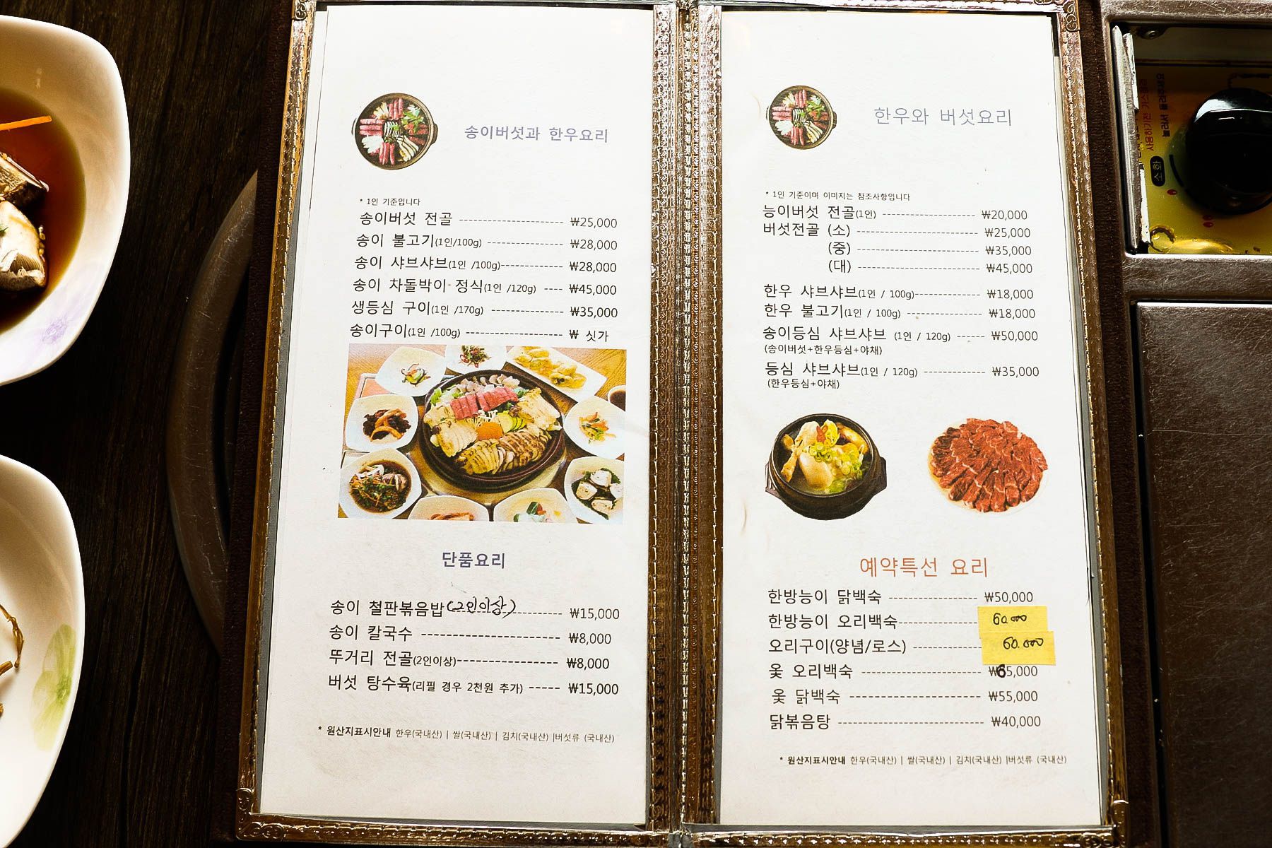 송이와 한우의 만남인 송이샤브샤브, 송이버섯의 진한 향을 맛볼 수 있는 송이전골이 이 집의 대표메뉴입니다.