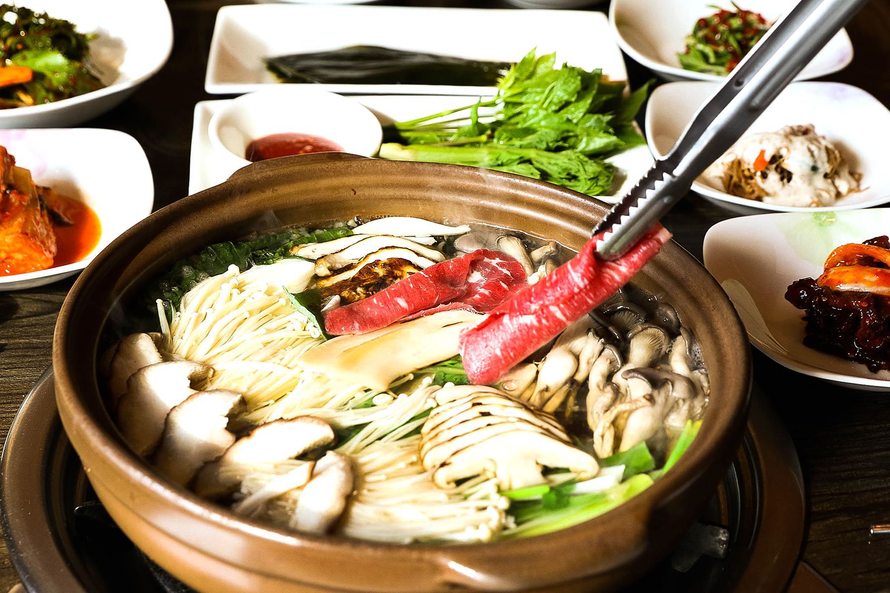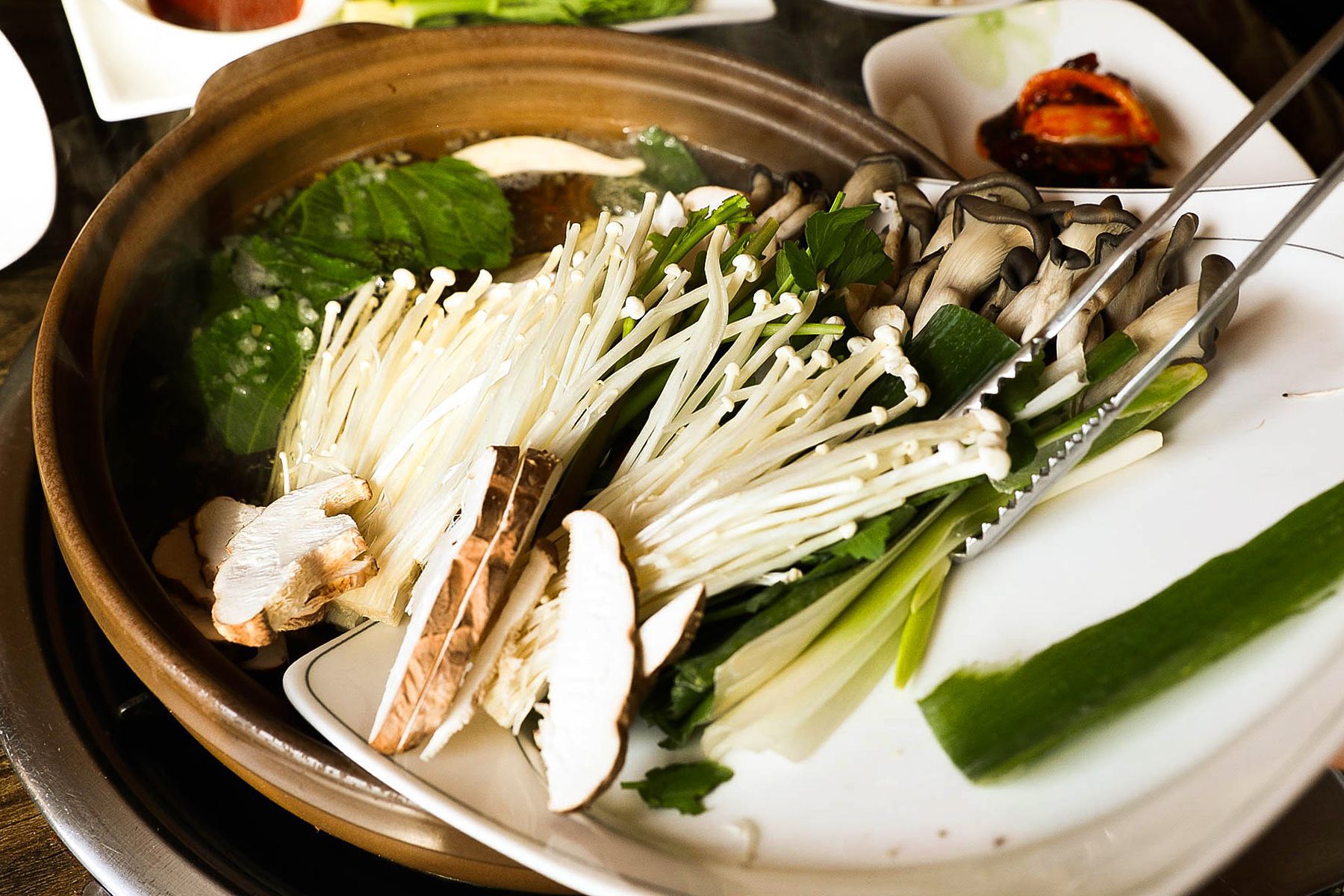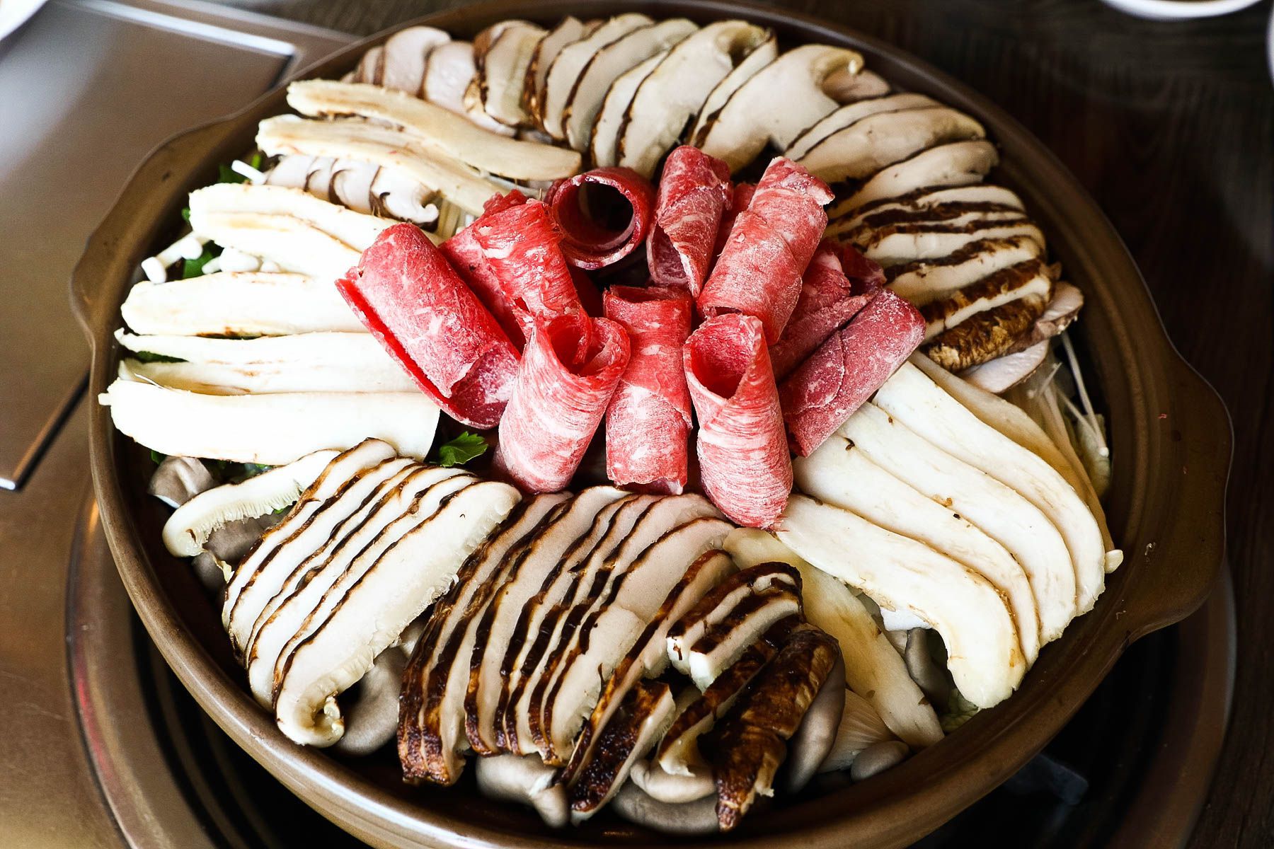 끓는 육수에 각종 버섯과 야채를 먼저 넣어 국물의 풍미를 살리고, 고기를 넣어 샤브샤브로 드시면 되는데요.