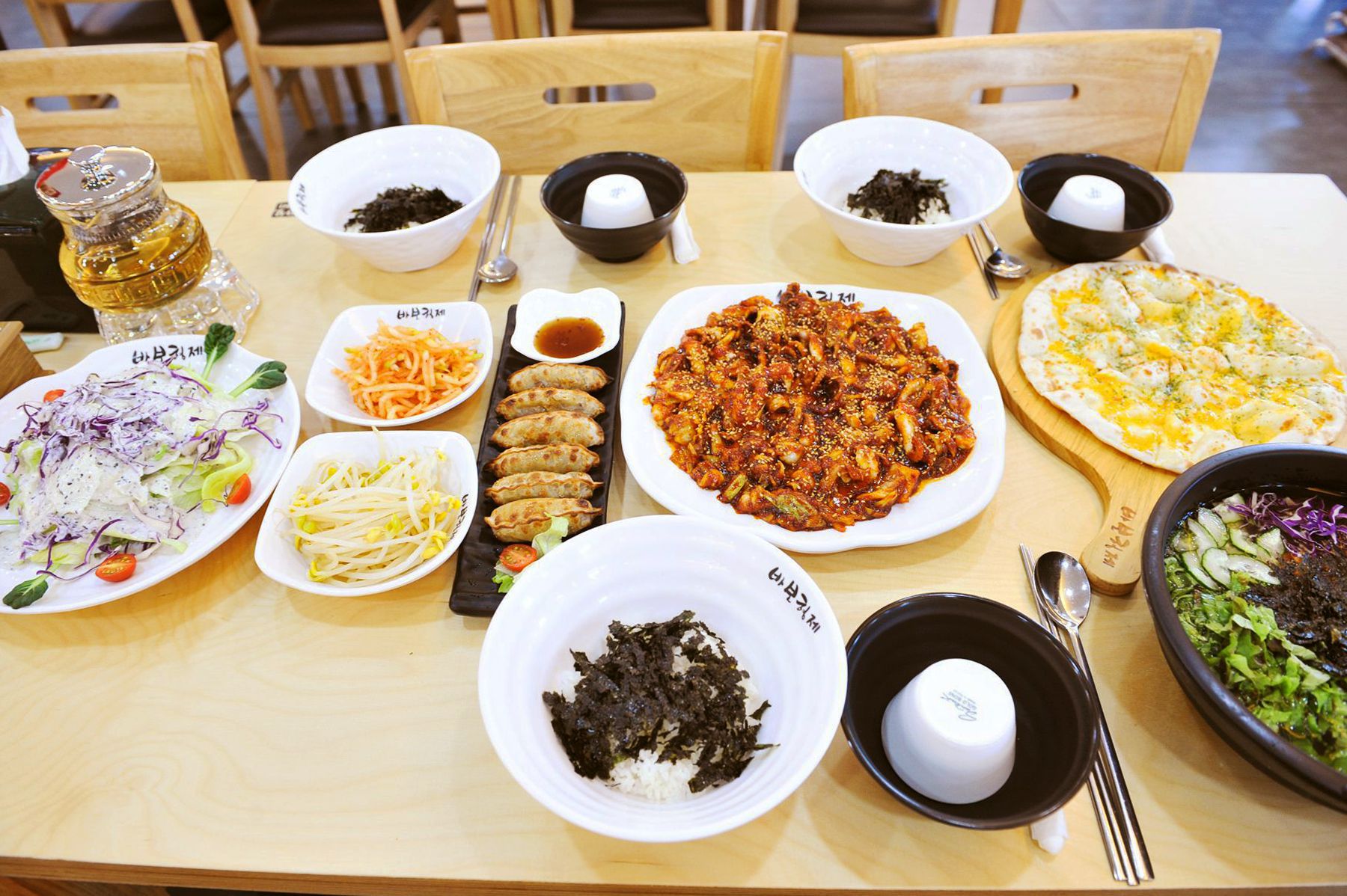 세트에는 양상추 발사믹샐러드+묵사발+고르곤졸라피자+쭈꾸미볶음이 포함되며 거기다가 비벼먹을 수 있게 밥,콩나물,무채,김까지 제공된답니다.