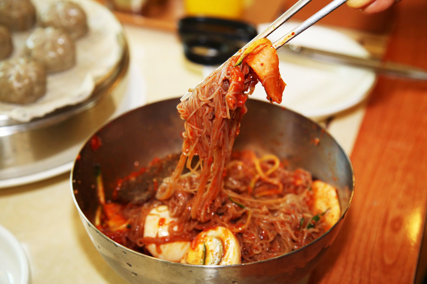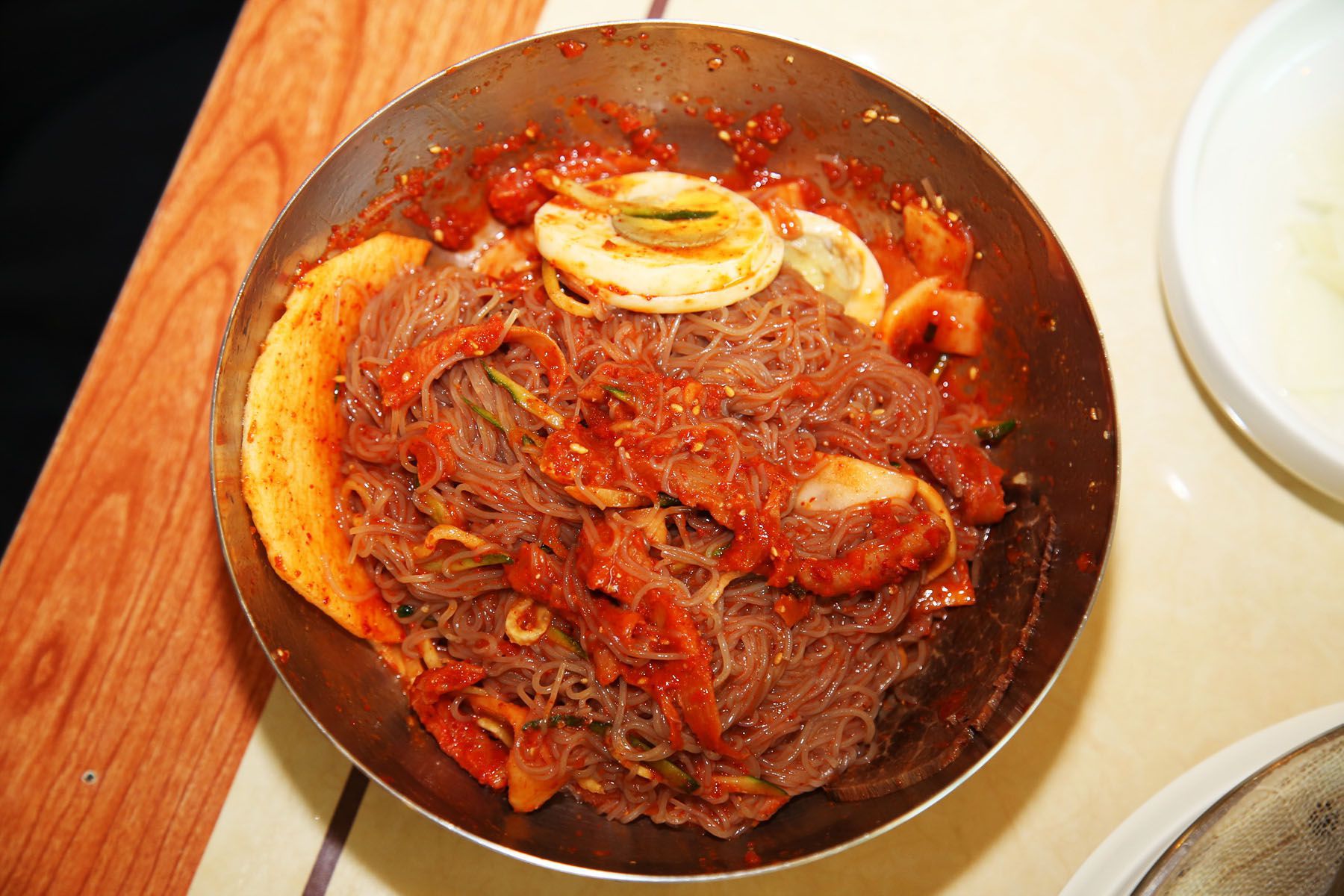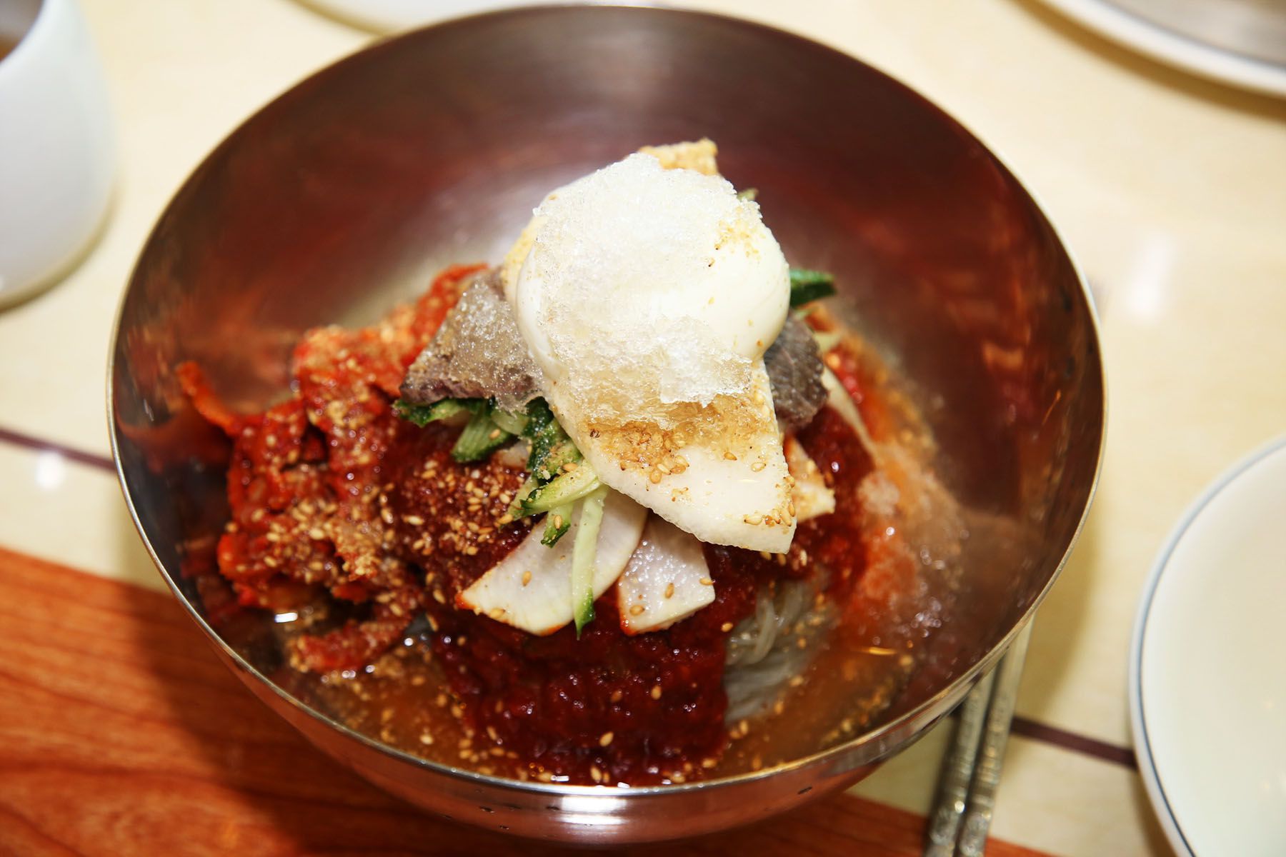 고추장이 아닌 순 고추가루만을 사용하여 숙성, 하여 냉면마니아들의 입맛을 사로잡고 있다고 하네요.