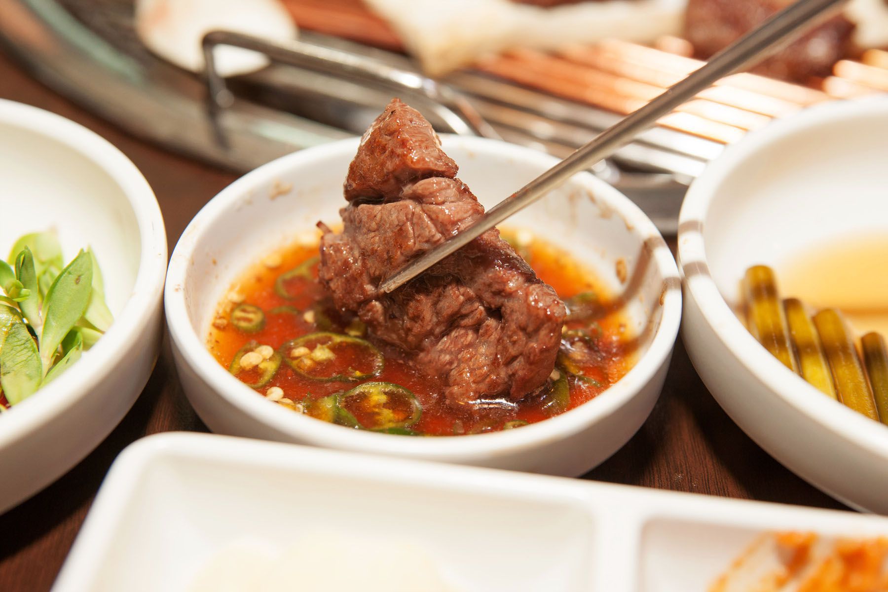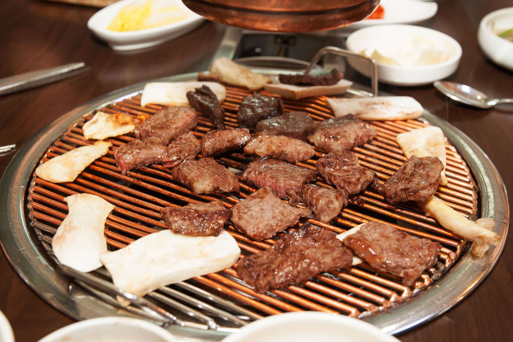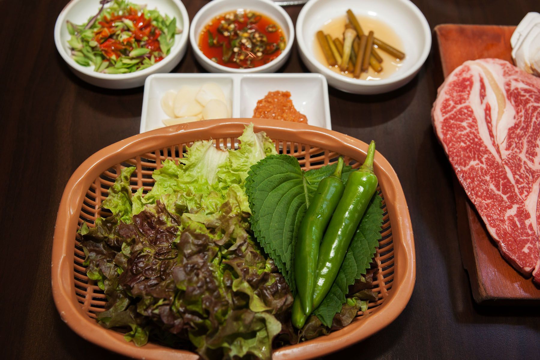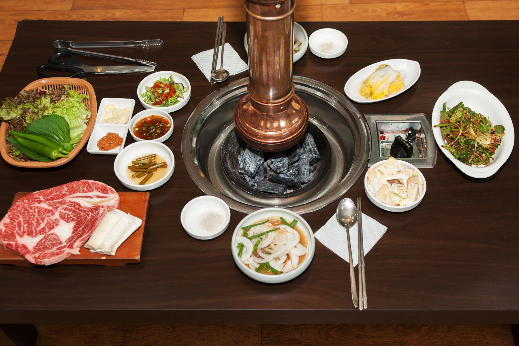 첫번째는 신선한고기이며 두번째는 고기를 더욱 맛있게 해주는 반찬들,마지막은 고기를 구워주는 참숯!