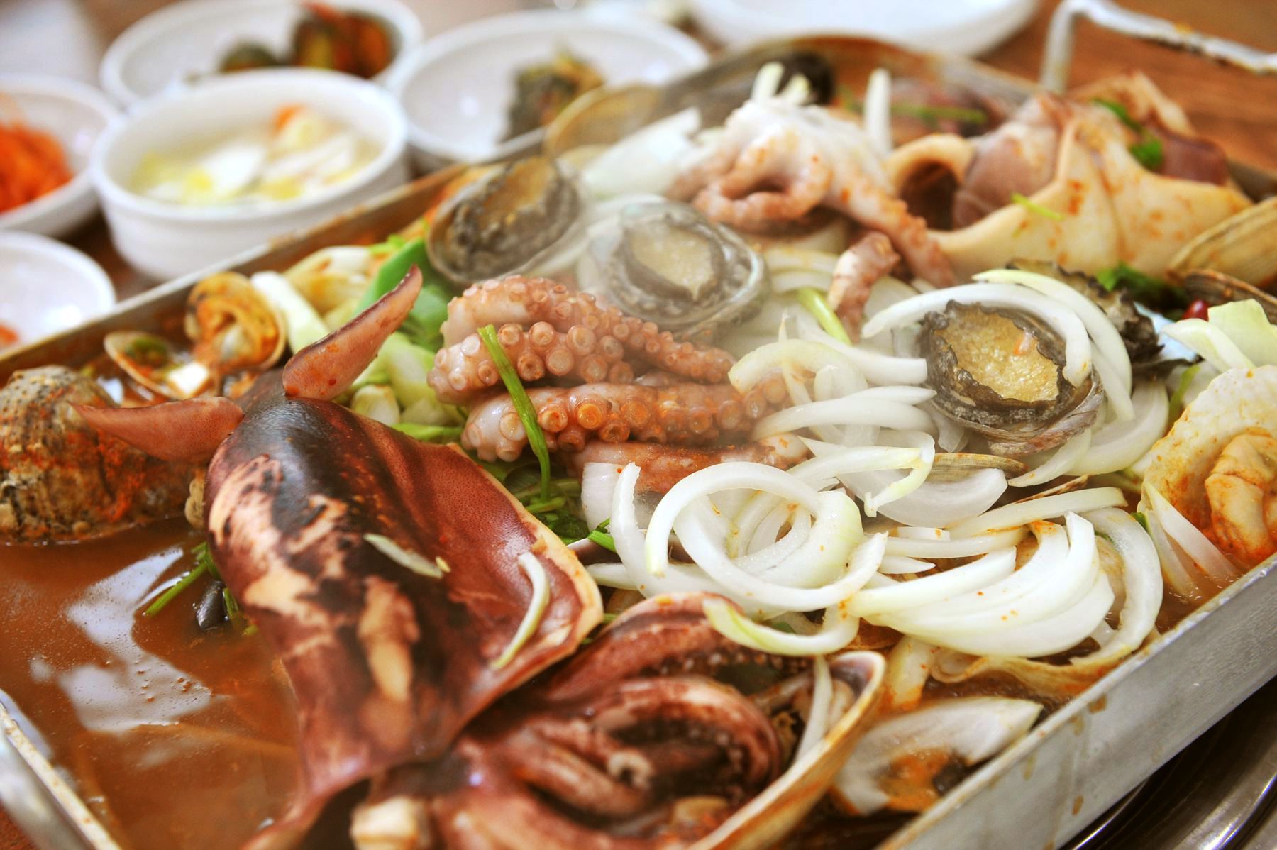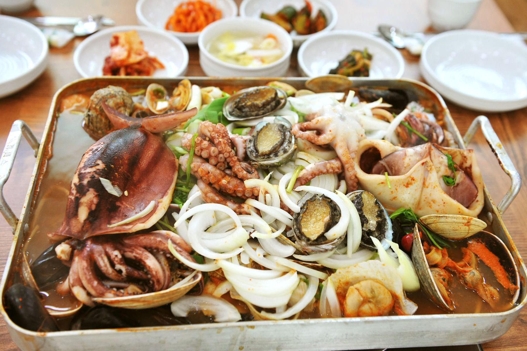 넓은 사각철판이 넘칠정도로 가득 해산물이 들어있는 해물탕은 어떠신가요~?