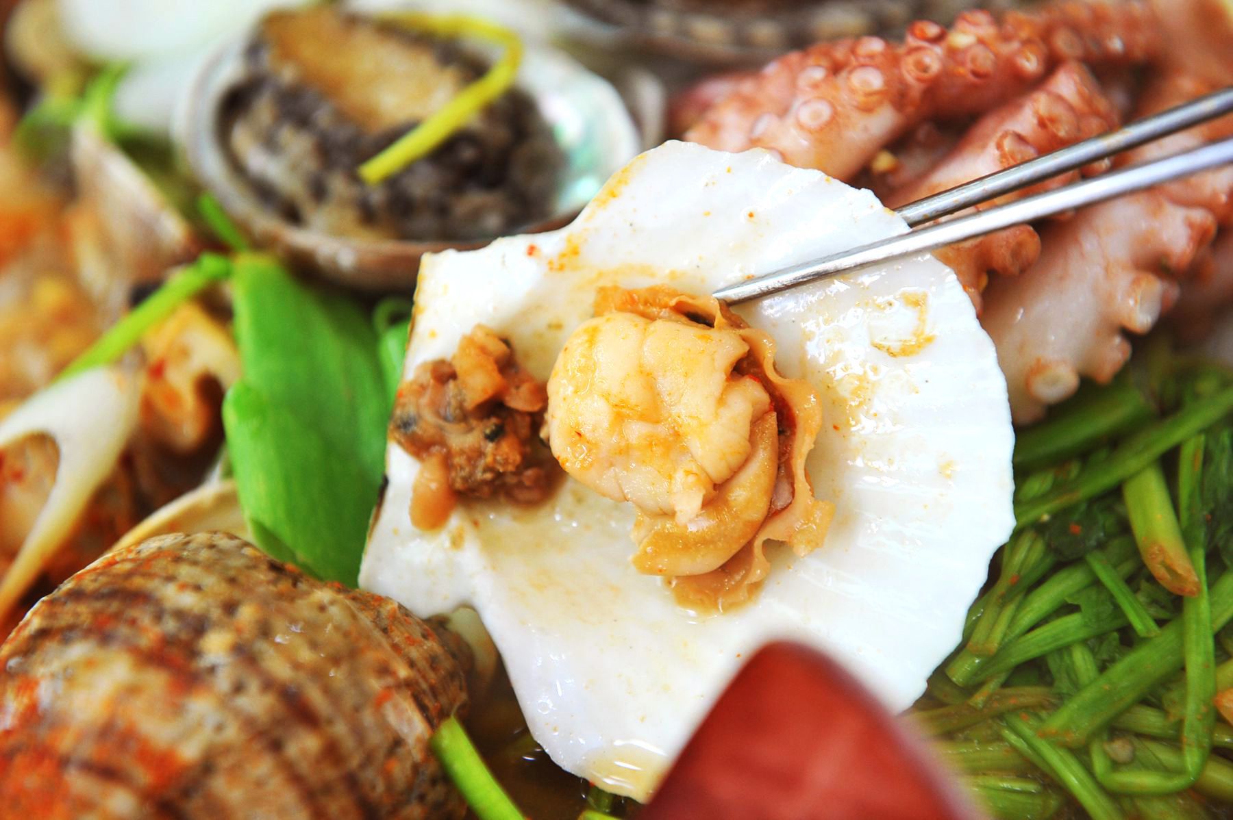 전복이 많이들어가며 낙지한마리,갑오징어한마리,가리비,대합등 푸짐한 해산물들 가득들어있으며