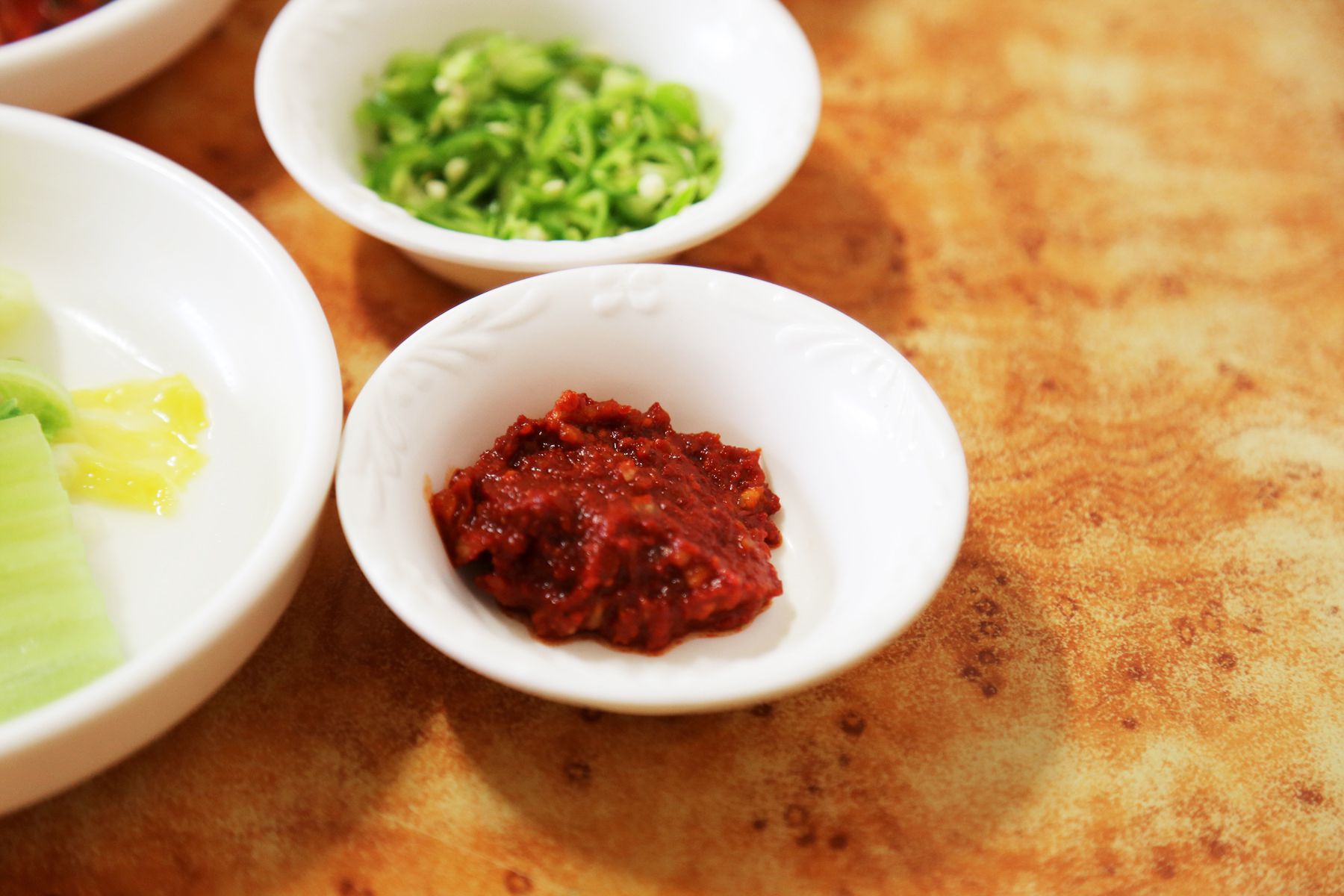 빨간양념장과 새우젓,청양고추를 취향에맞게 넣어 드시면 됩니다.