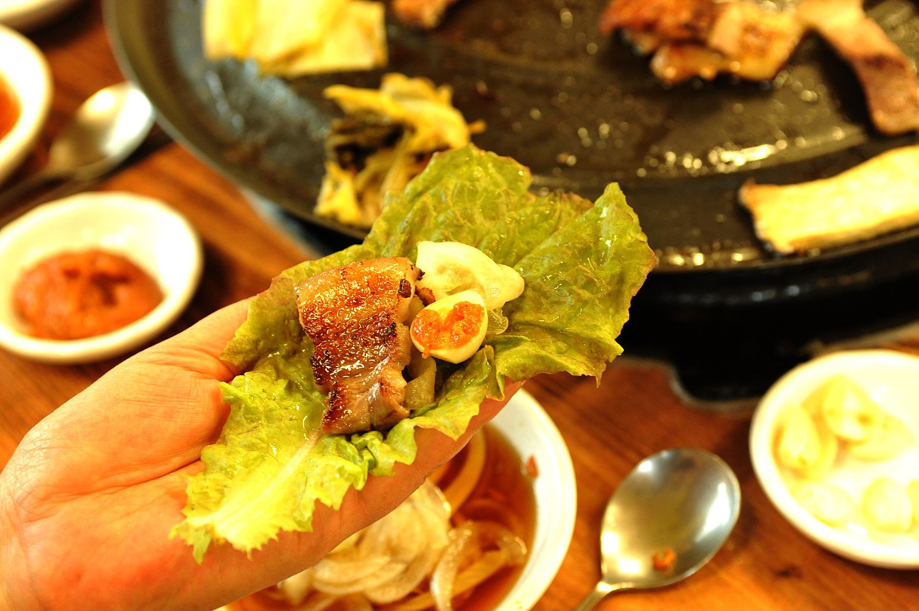 함께 제공된 양파절임을 곁들이거나 상추위에 다양한 재료를 얻고 쌈을 싸서 먹으면