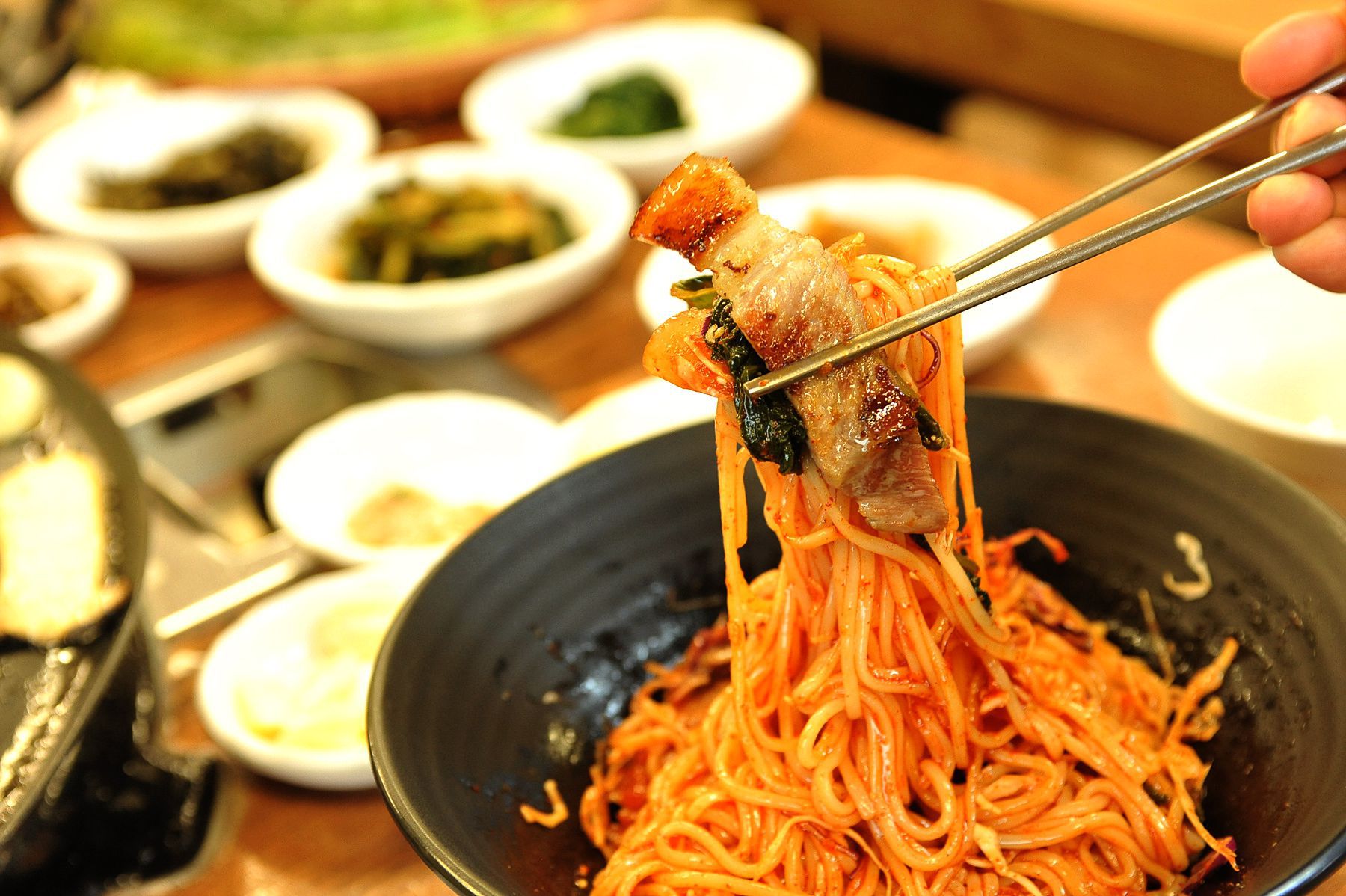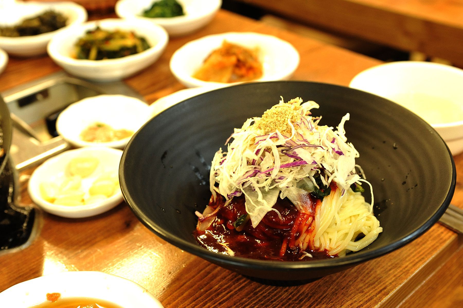 신선한 야채와 매콤한 소스가 잘 어우러지는 비빔국수도 정말 맛있고 남은 고기를 곁들여 먹으면