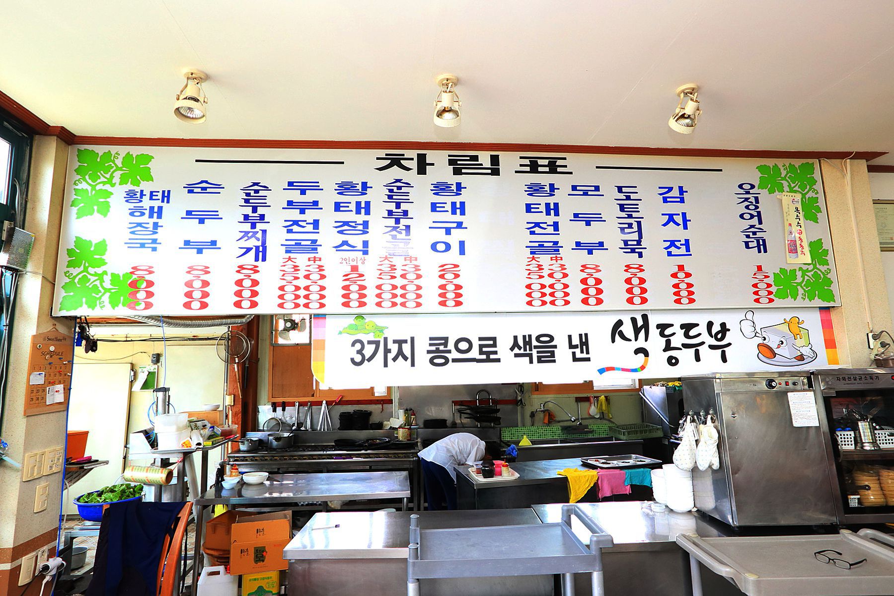 두부전골, 순두부찌개, 황태해장국, 황태구이, 도토리묵, 황태전골, 감자전등