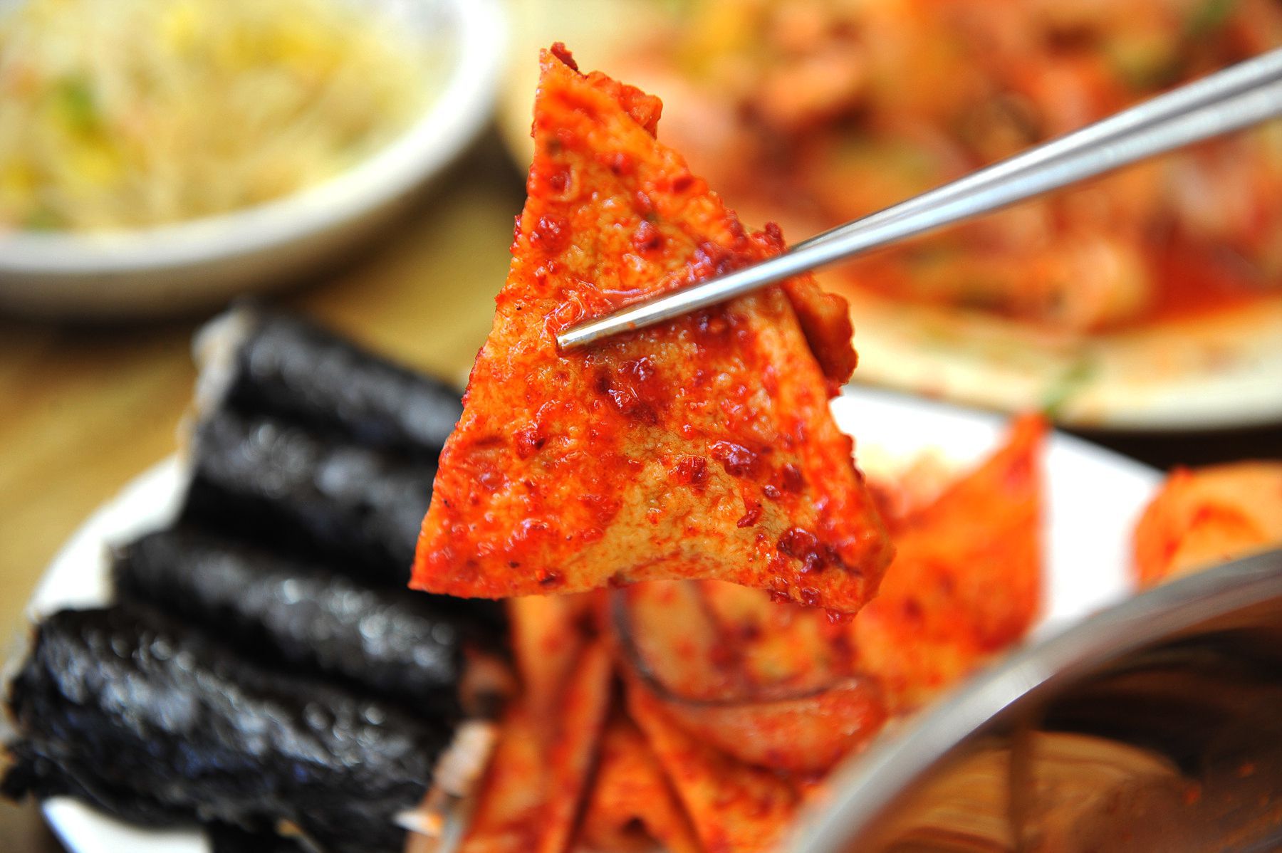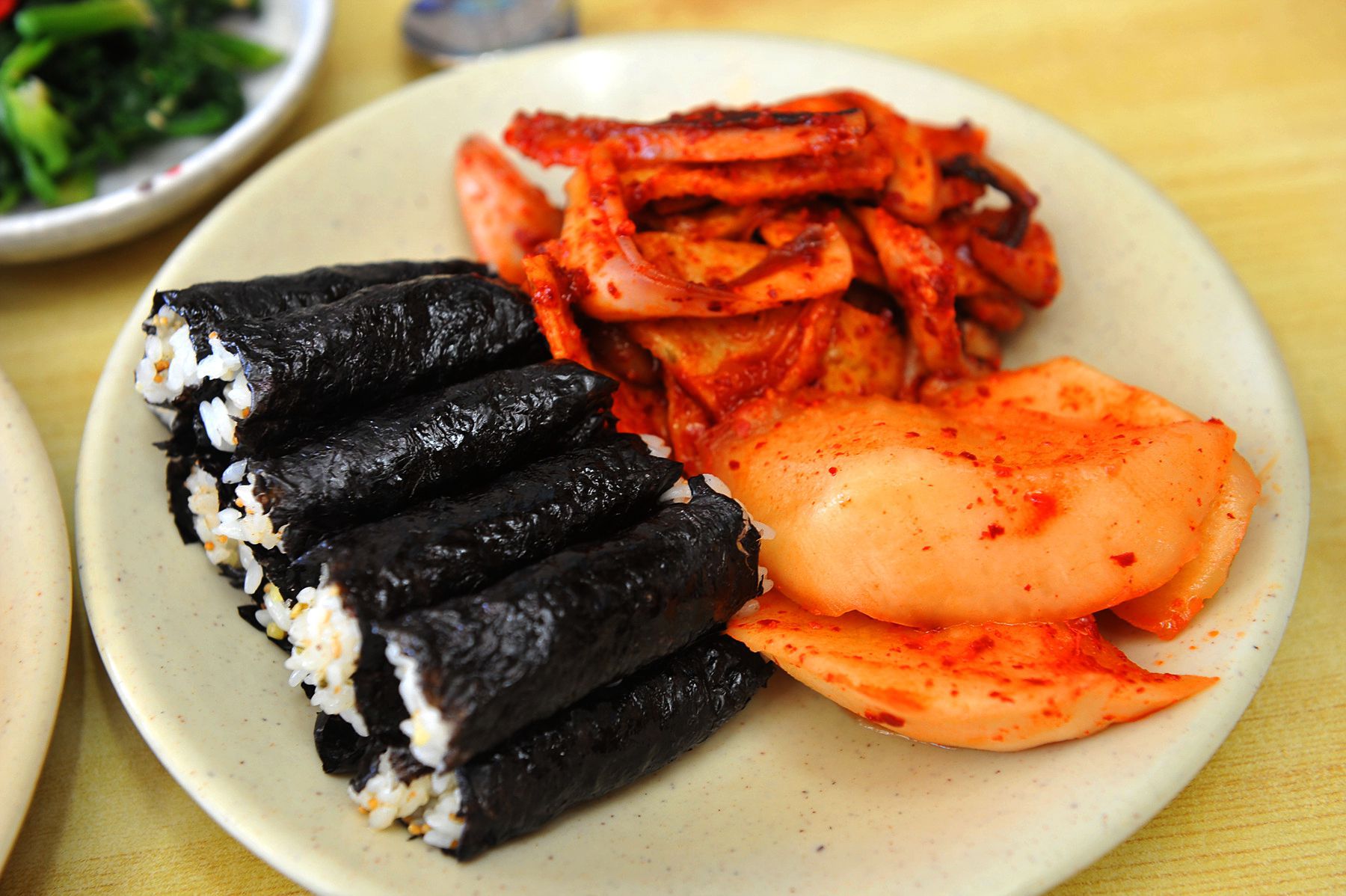 고소한 기름과 깨가 들어가 돌돌 말린 김밥과 잘익은 깍두기,매콤달콤하게 무쳐진 오징어,오뎅 무침은