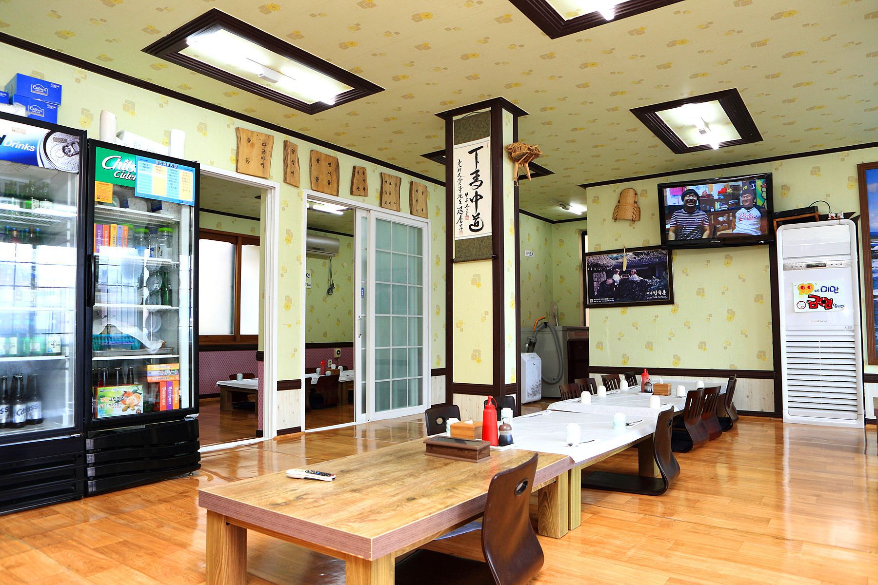 미끄러질듯하게 깨끗하게 청소되어 있는 바닥과 청결한 테이블, 편안한 좌식의자가 마련되어 있어