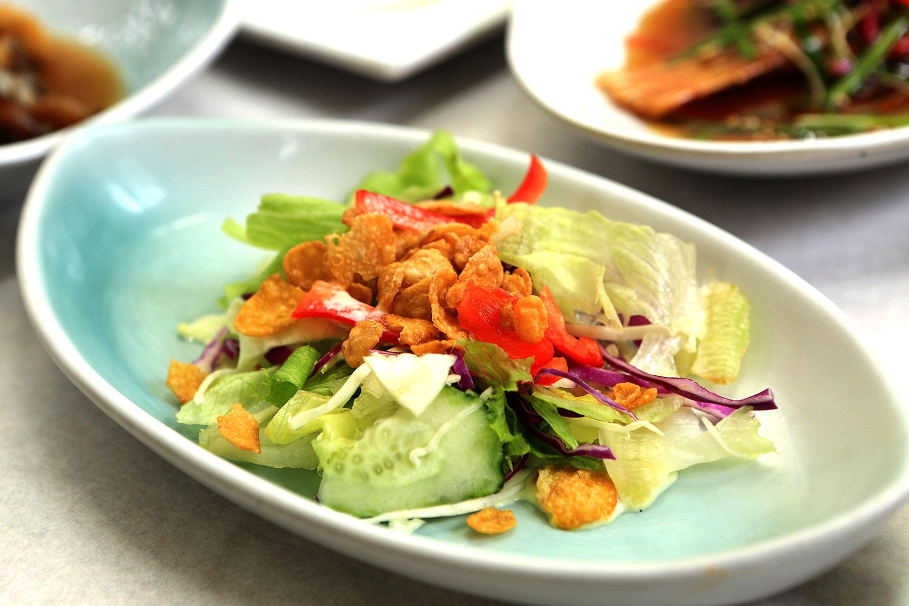 다양한 채소와 콘프라이트를 곁들여 먹는 샐러드는 아삭함과 바삭함이 함께 느껴지고