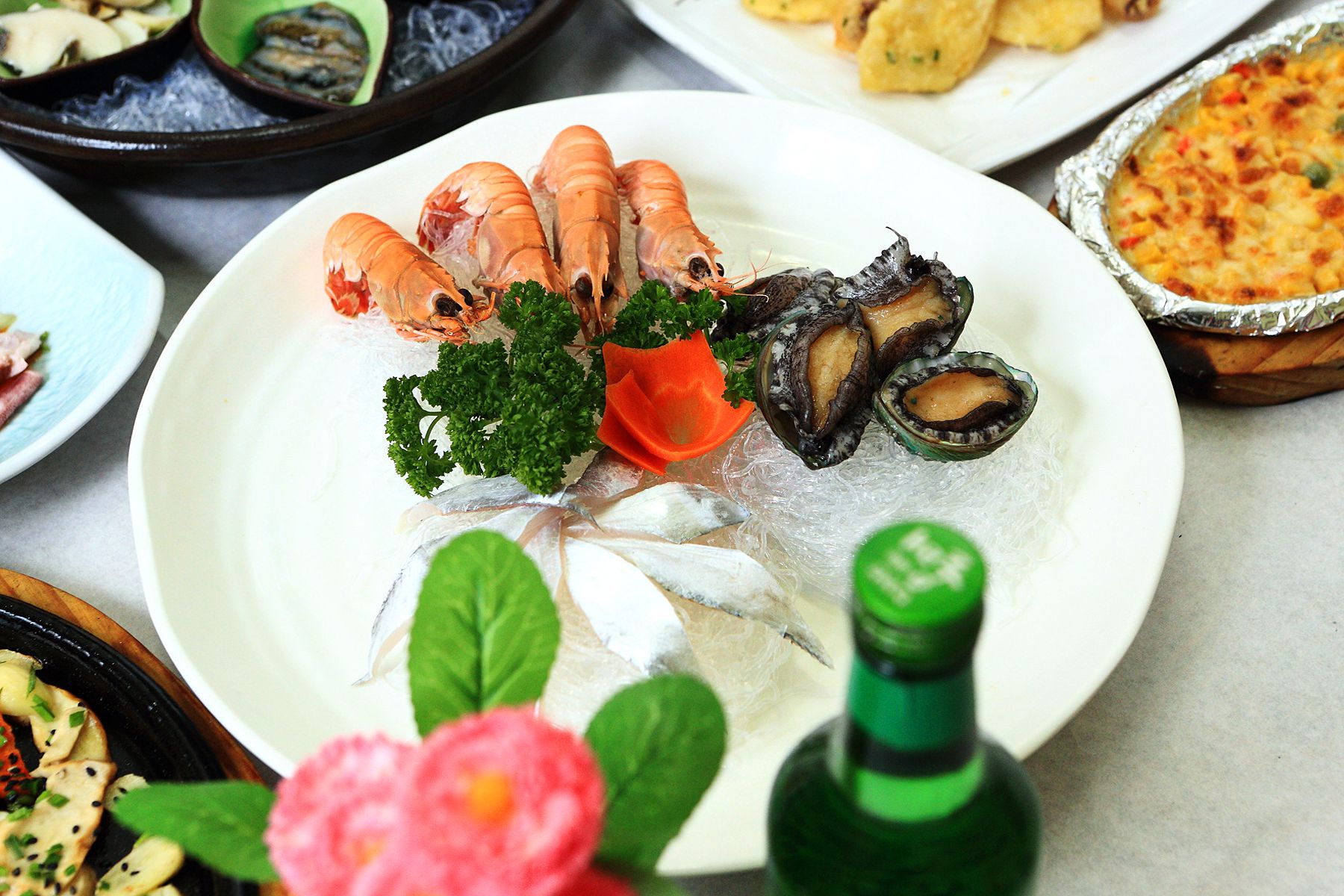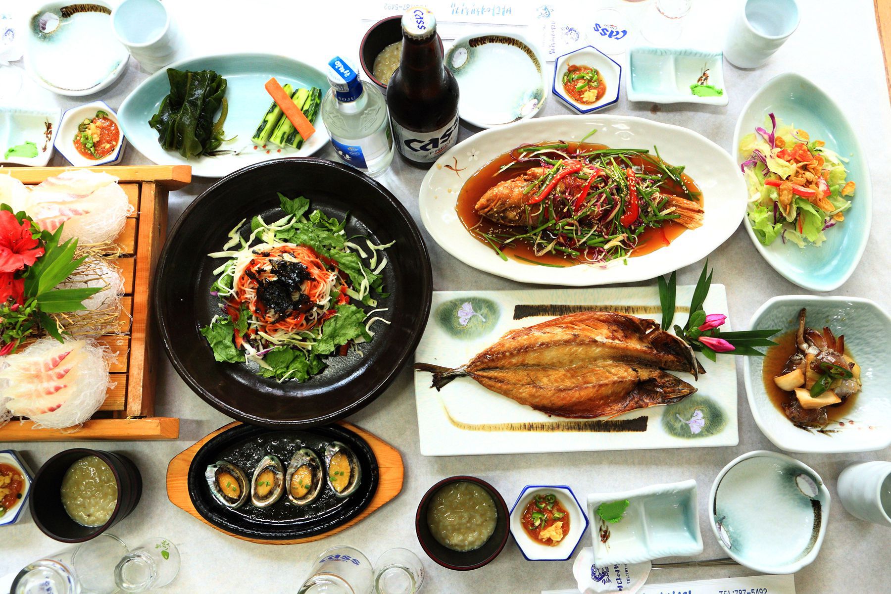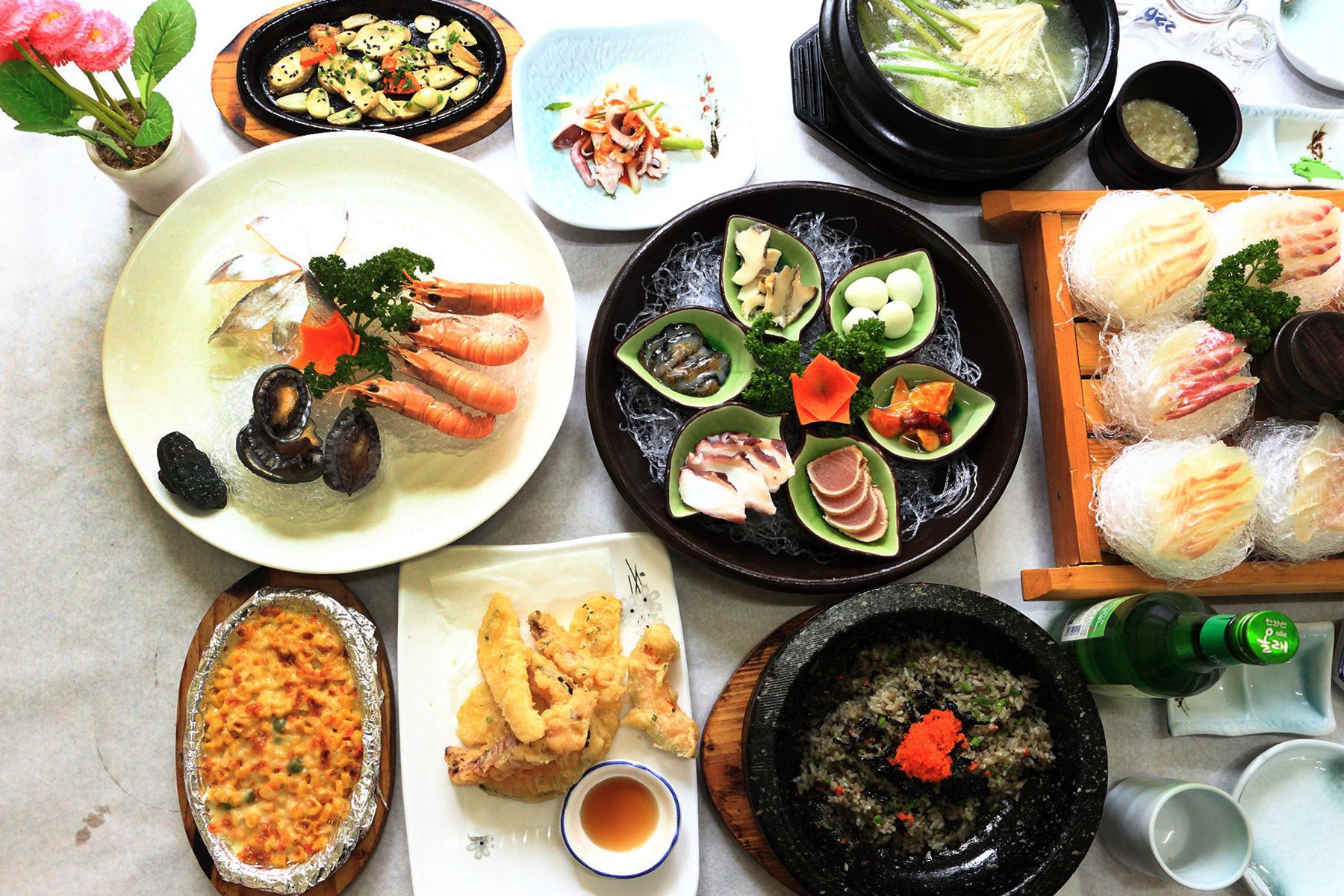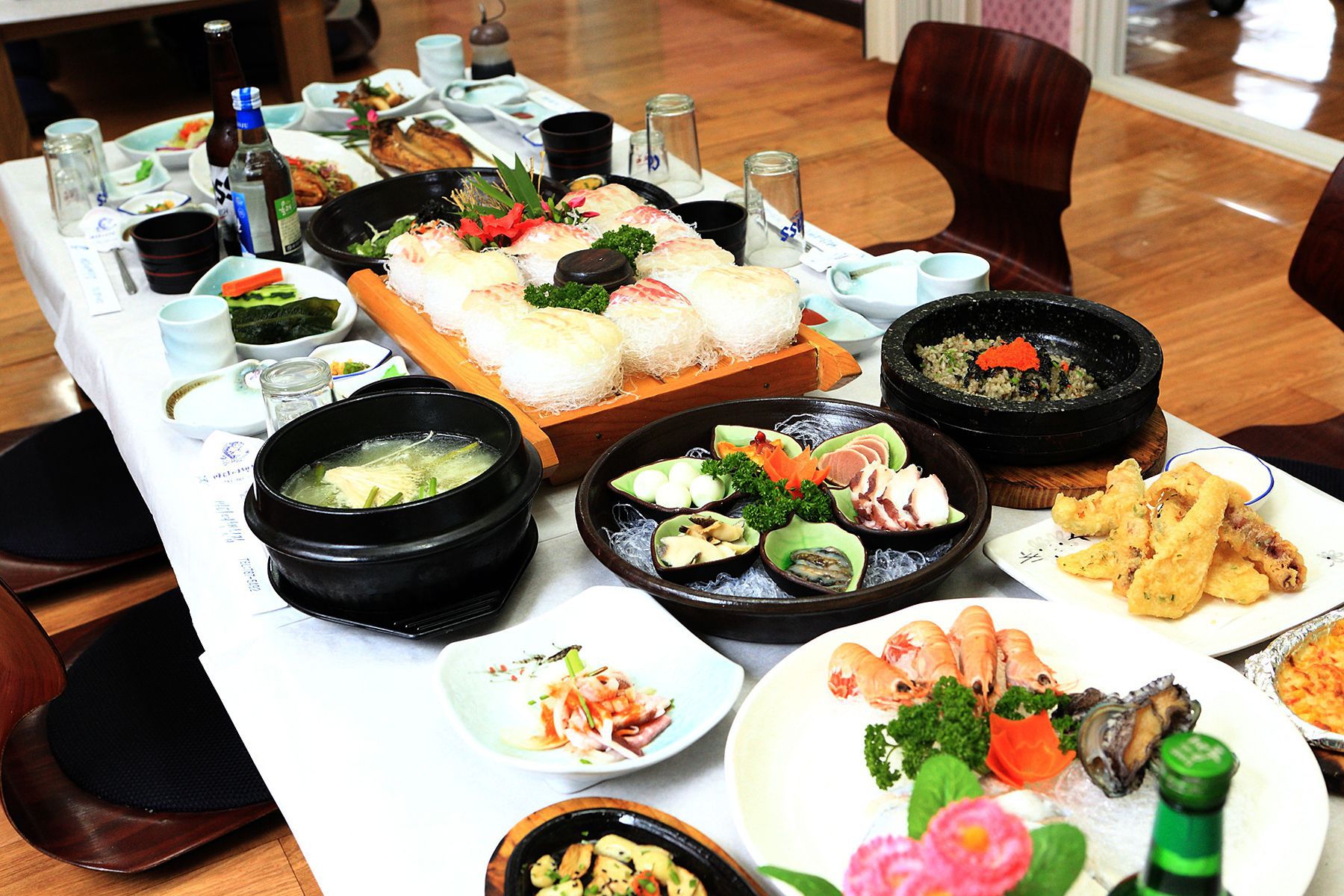 해산물 요리로는 딱새우,전복,문어,뿔소라,멍게,해삼,육소라,키조개,쭉꾸미,갈치회가 필수로 제공되는데
