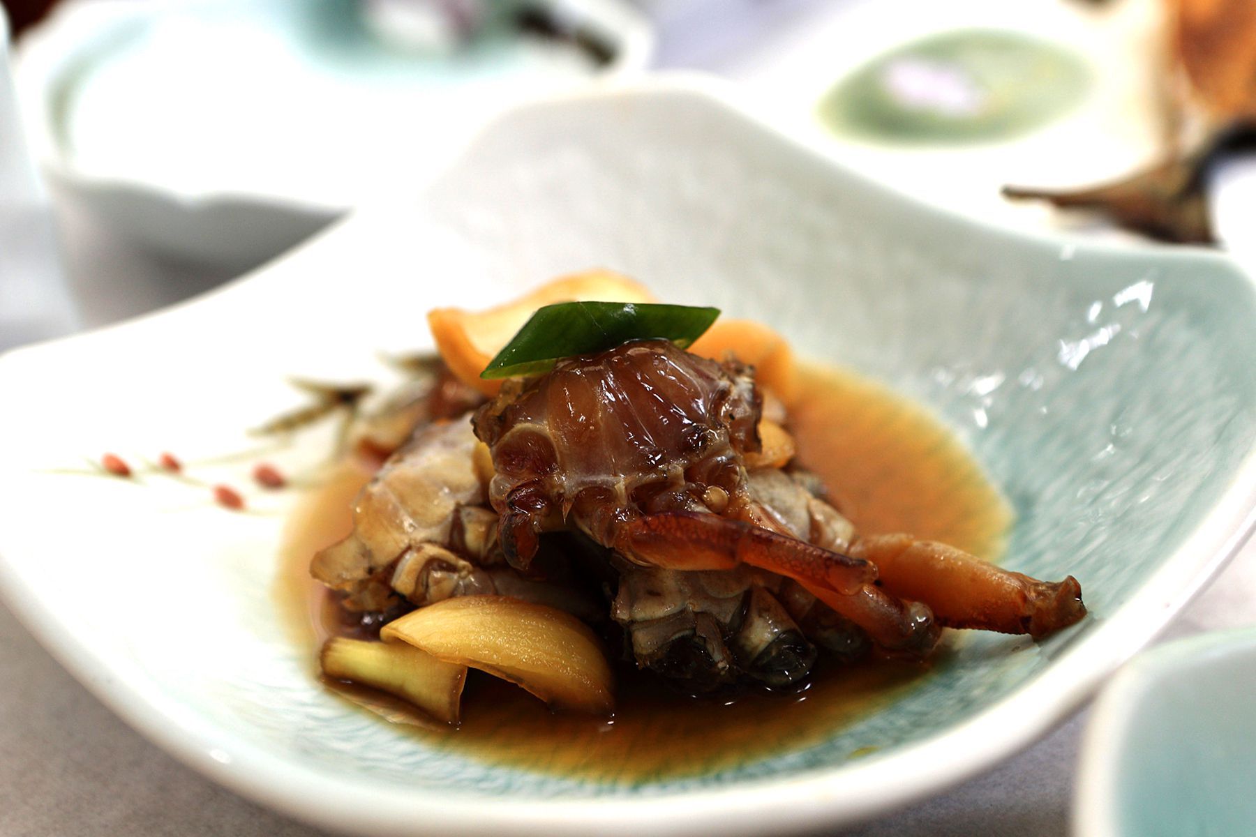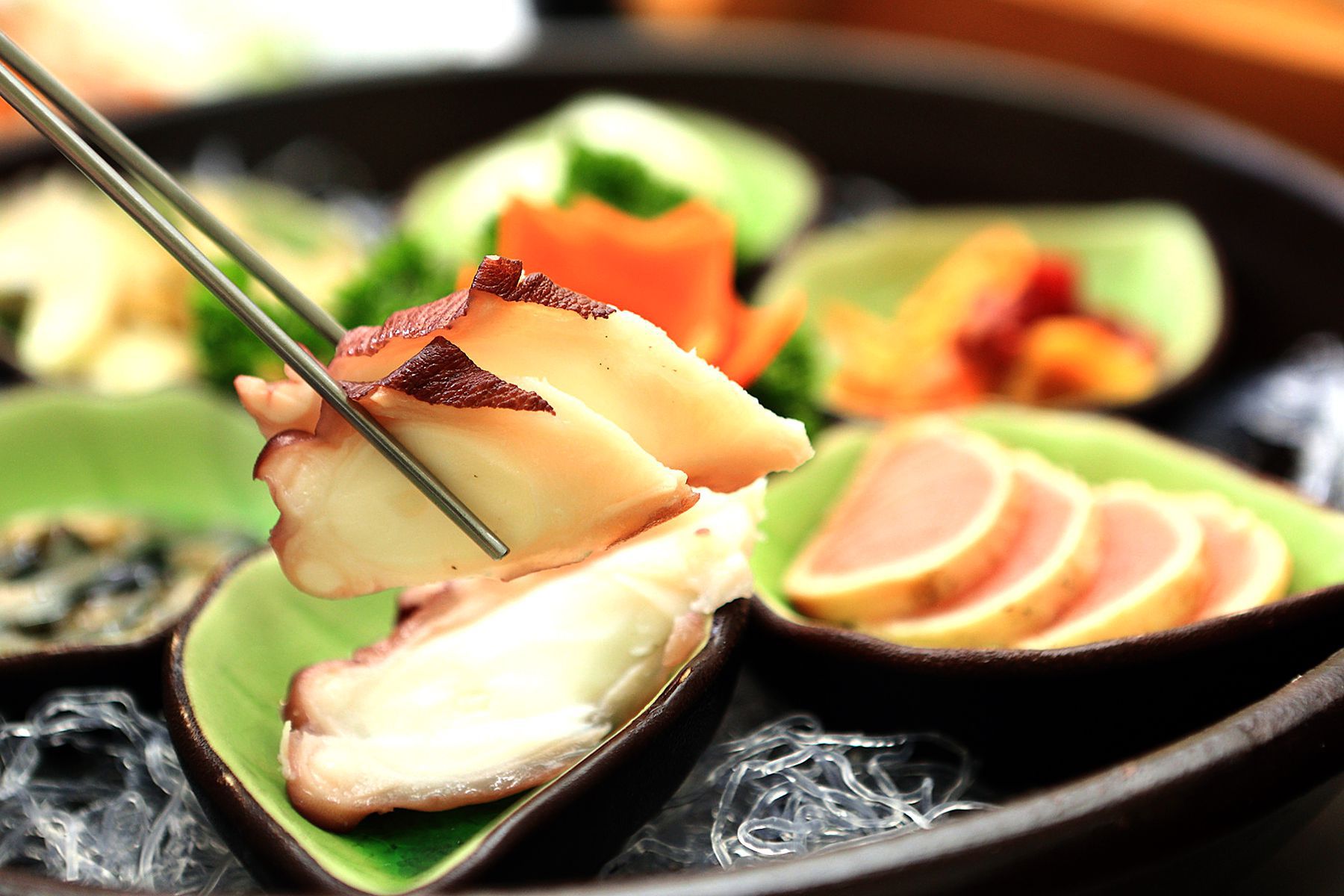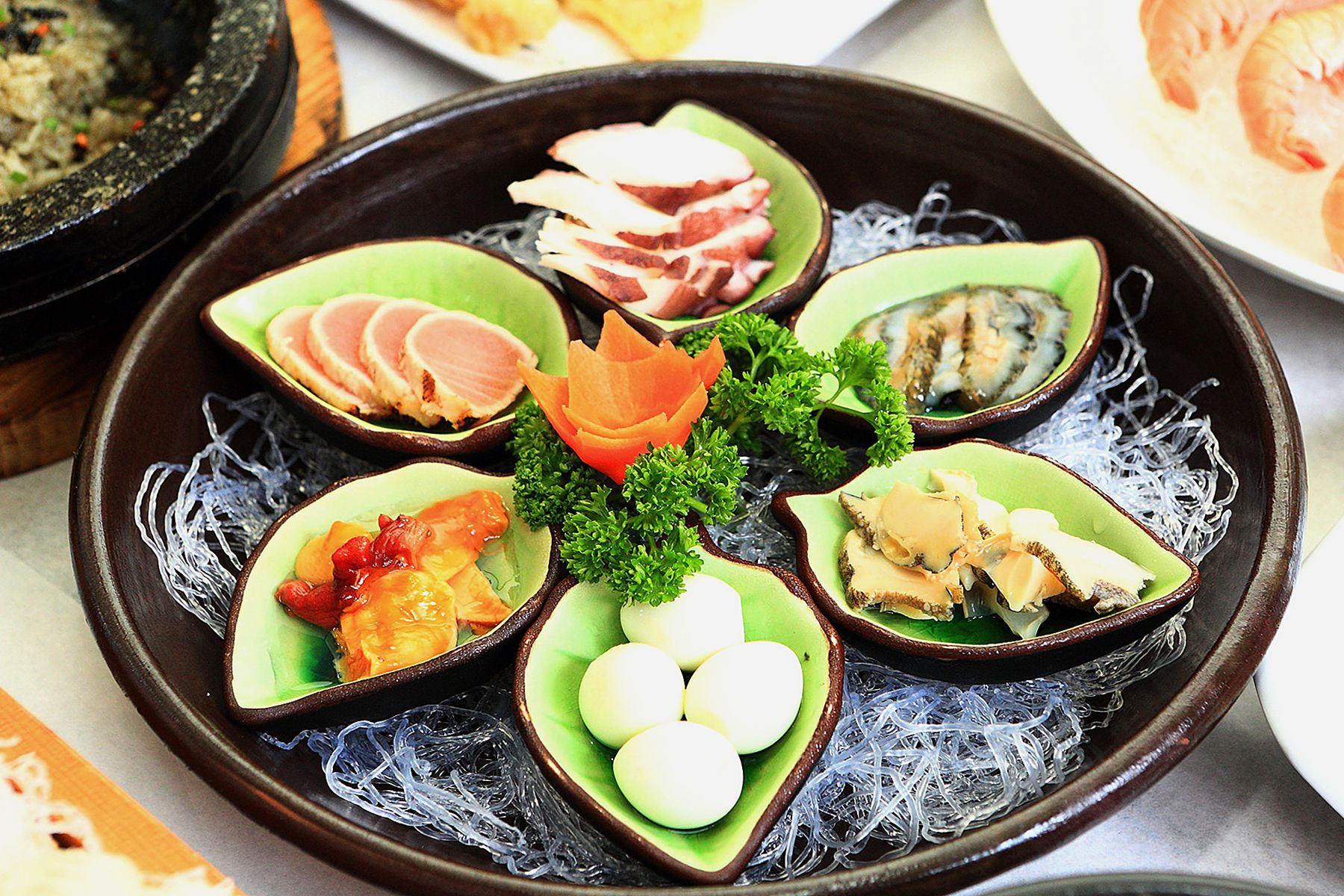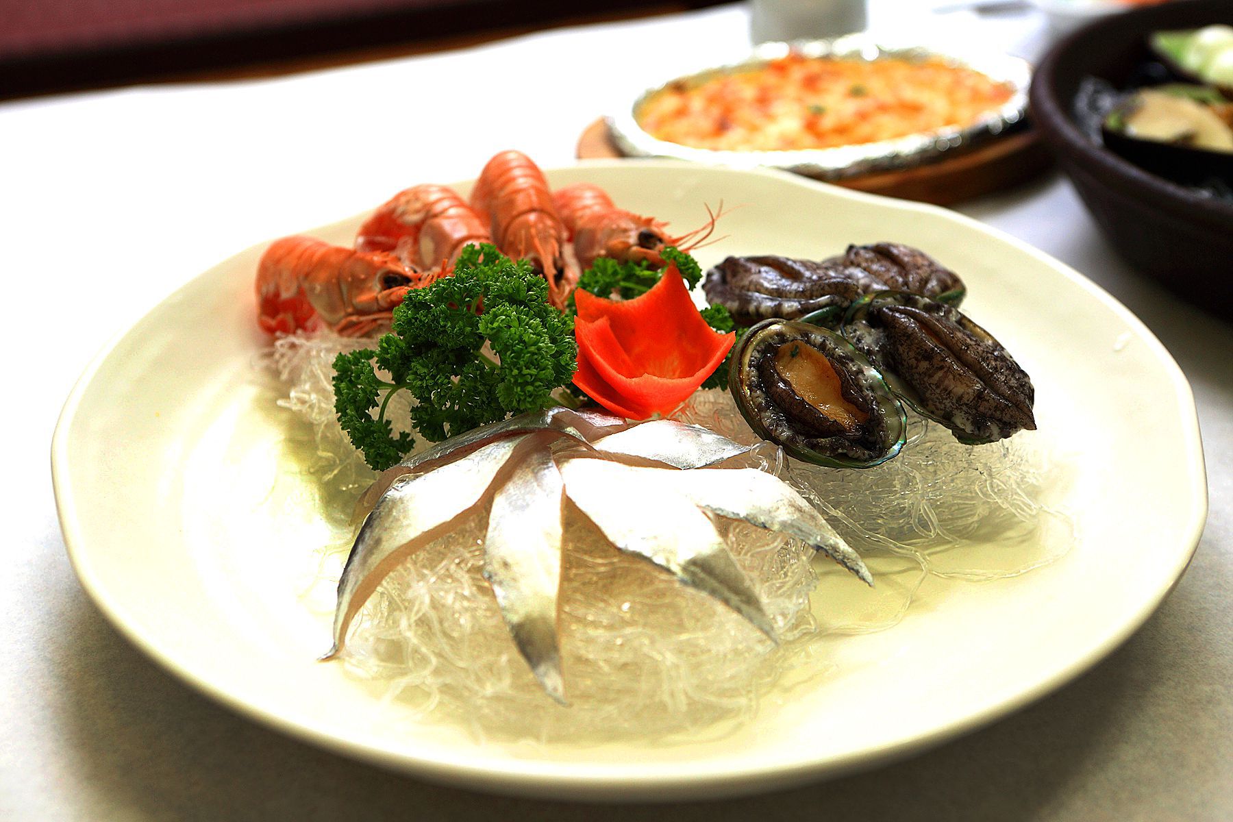 해산물 요리로는 딱새우,전복,문어,뿔소라,멍게,해삼,육소라,키조개,쭉꾸미,갈치회가 필수로 제공되는데
