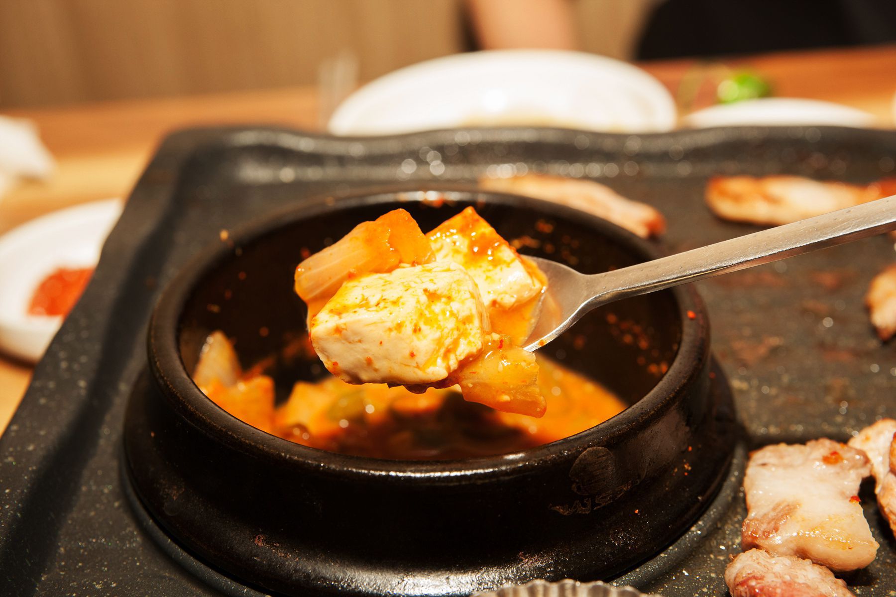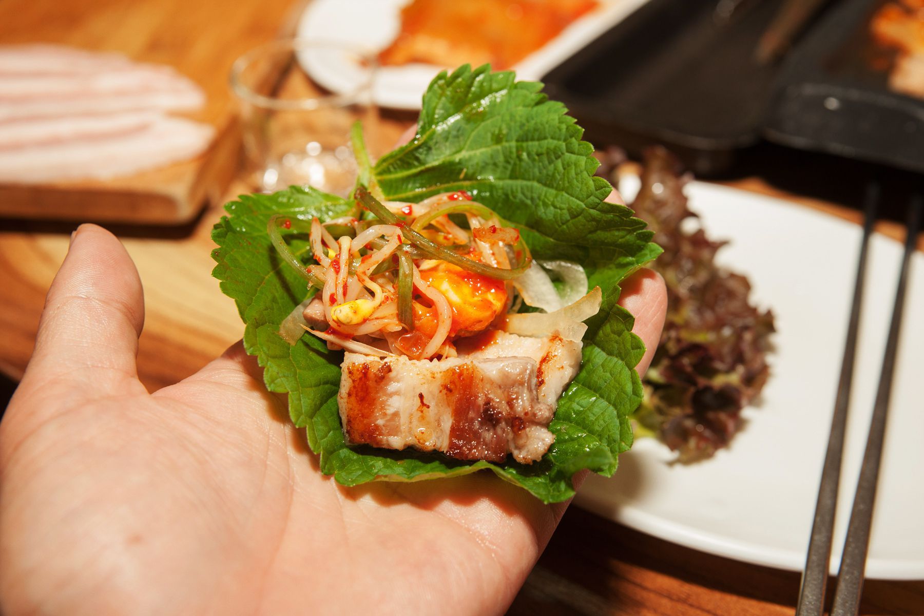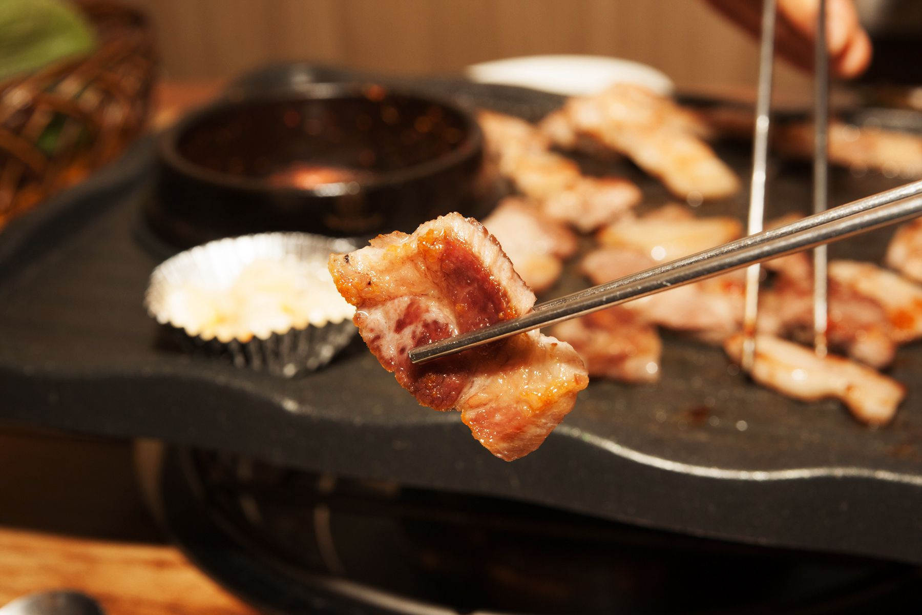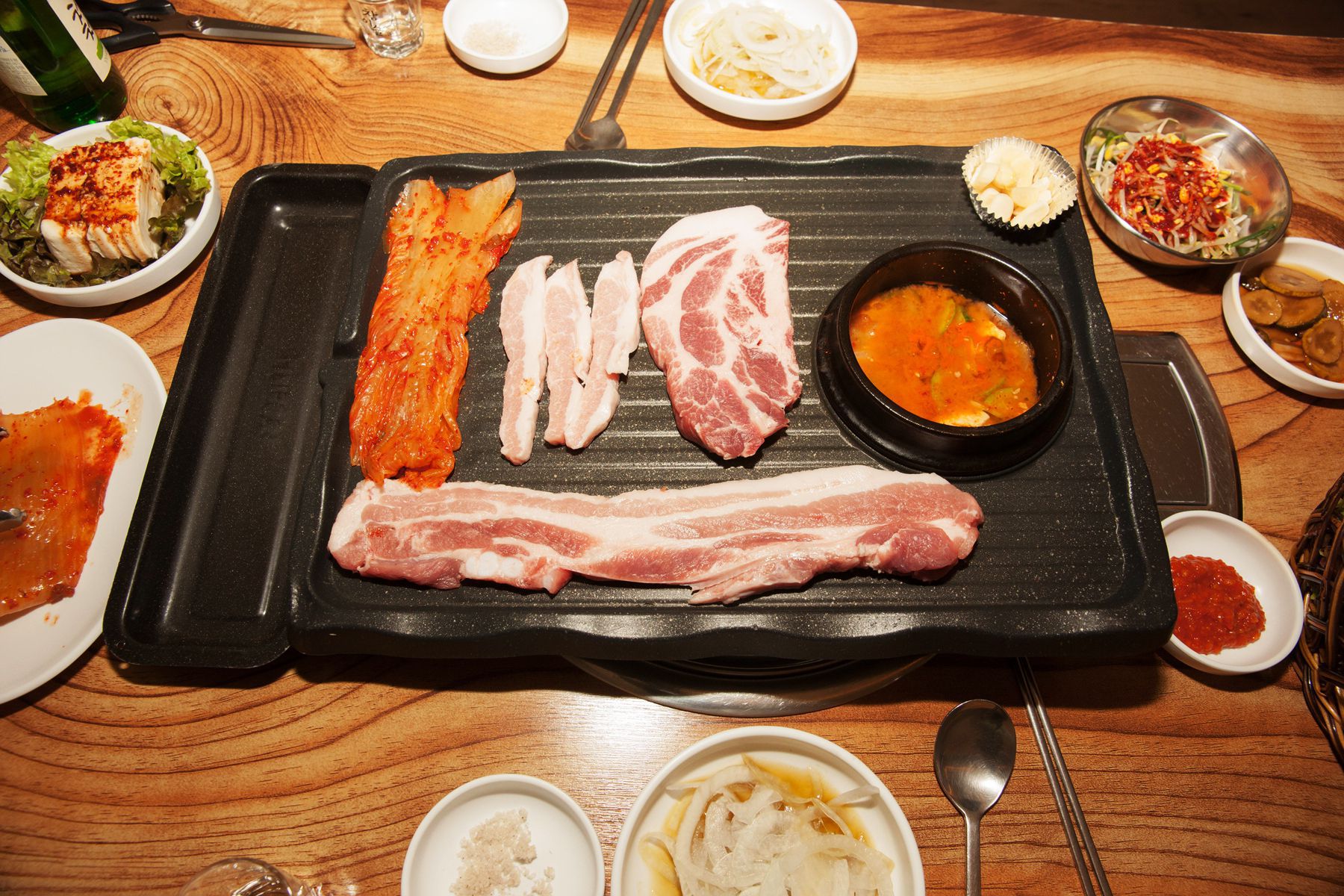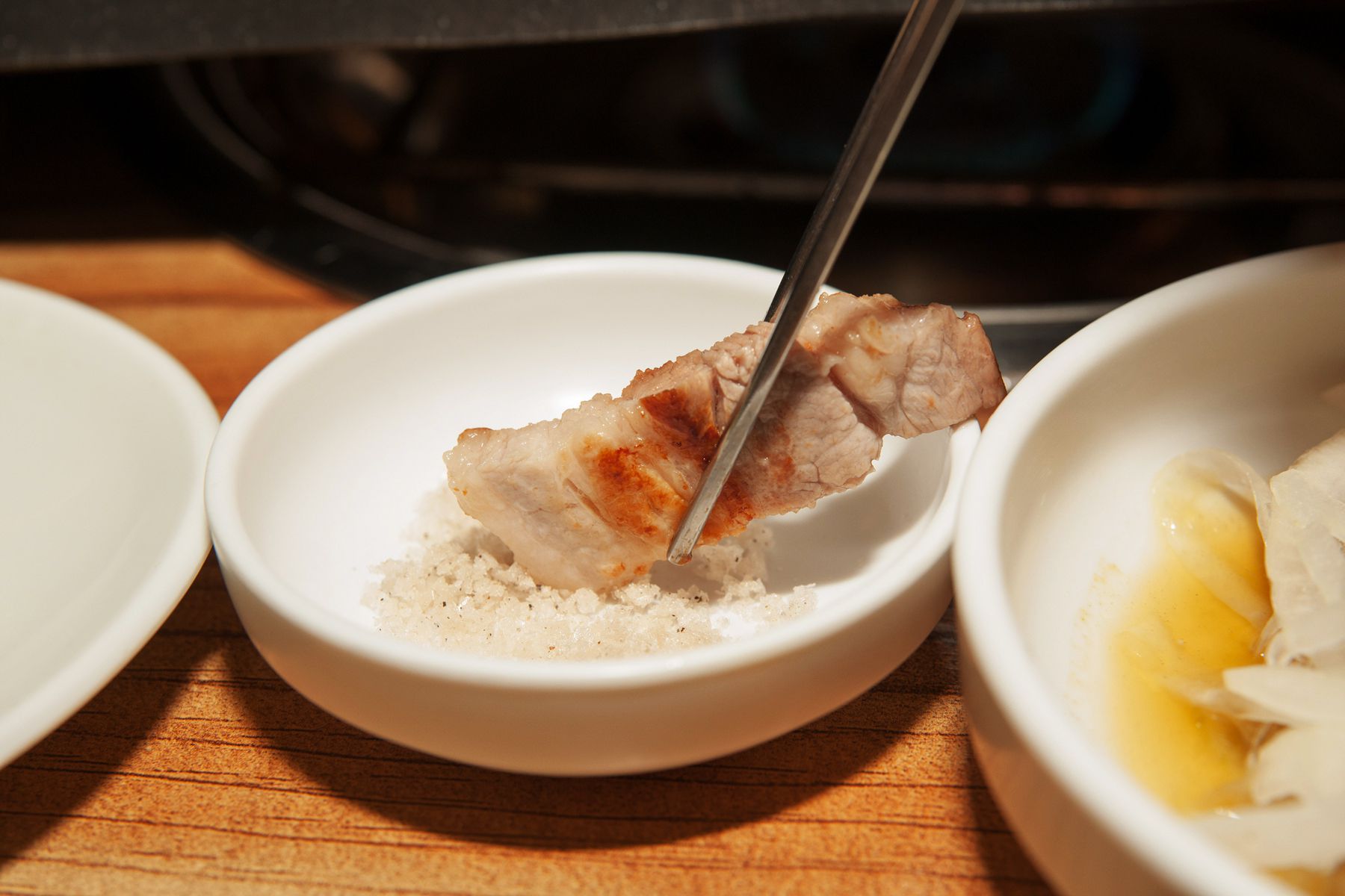 돌판에서 지글지글 익어가는 도톰한 삼겹살은 소금에 찍어먹어도 맛있고