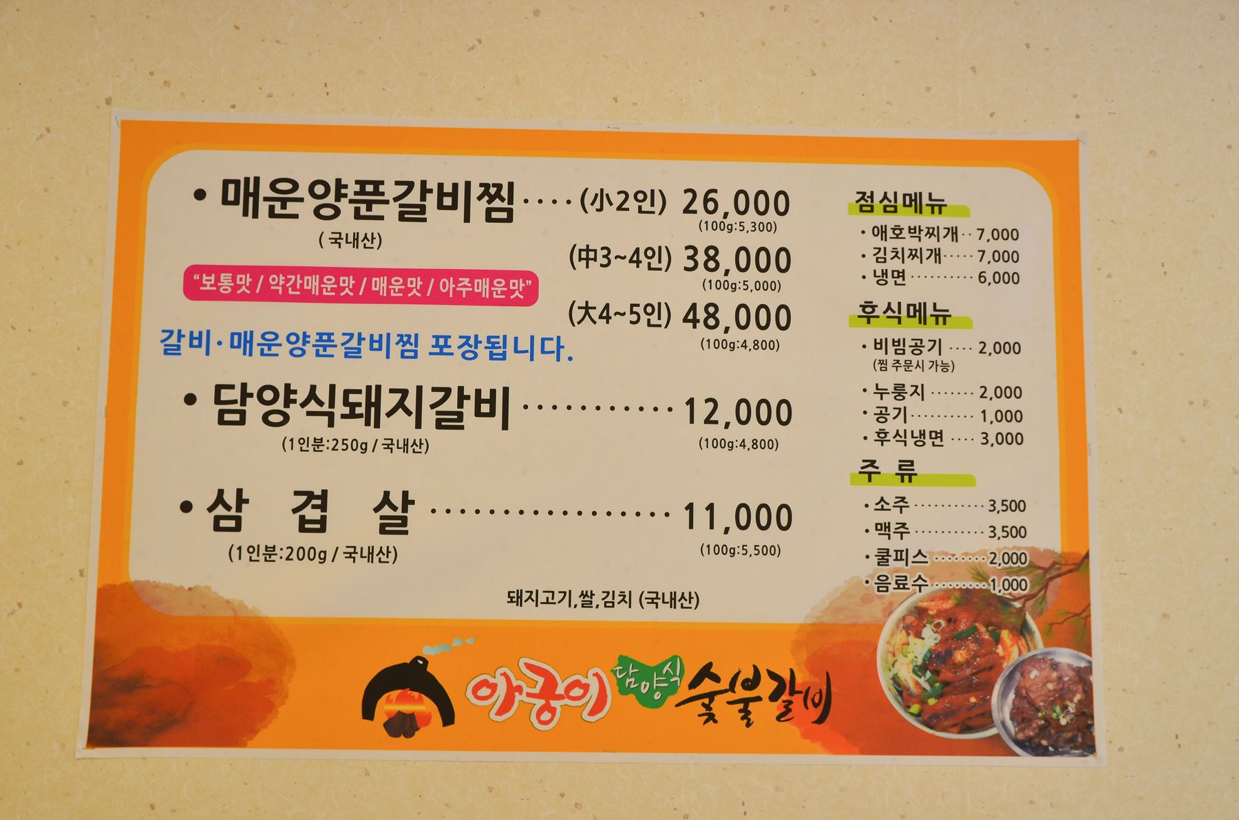 대표메뉴로는 매운양푼갈비찜,담양돼지갈비,삼겸살이 있으며