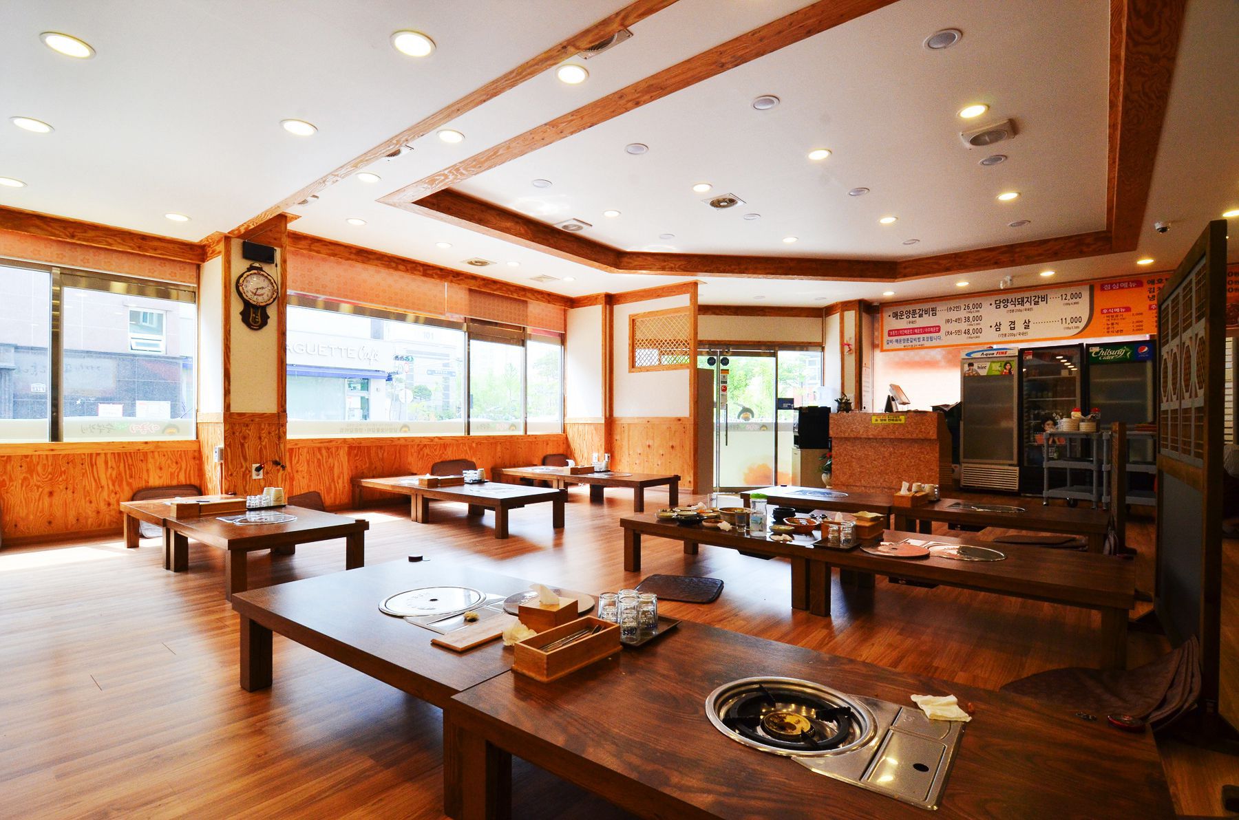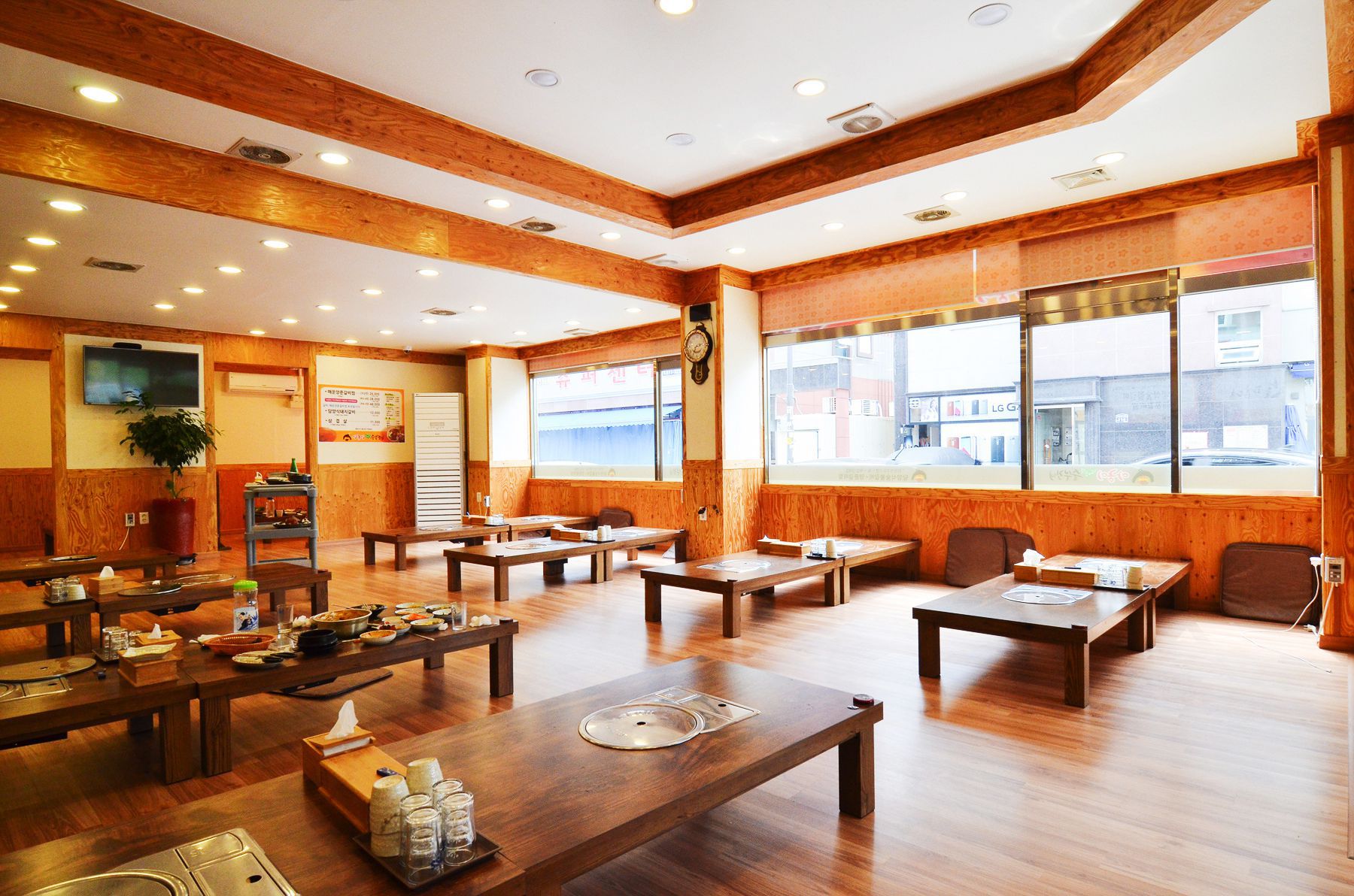 깔끔한인테리어와 테이블이 20개가 준비되어있는 50~60명의 단체손님들도 한번에 수용가능하며