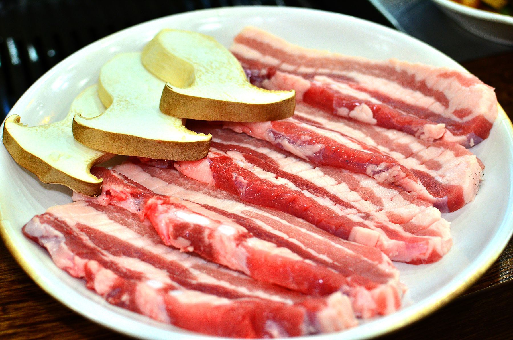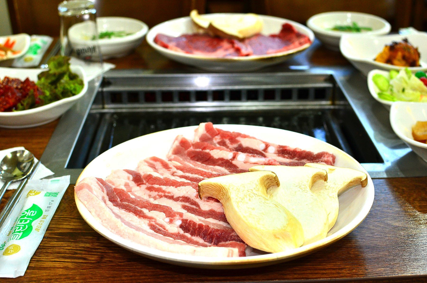 도톰하게 썰어진 생삼겹살은 두껍지만 타지않고 골고루 잘 익혀지도록 손질되어 나오고