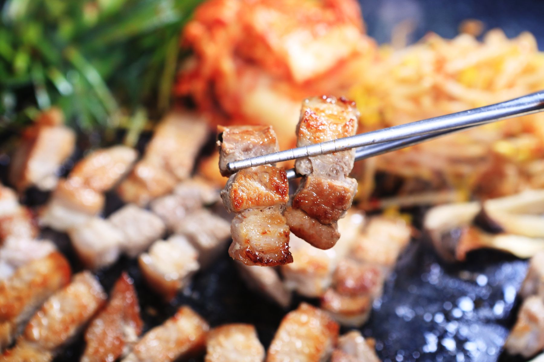 돌판 위에서 맛있게 익은 제주흑돼지오겹살!