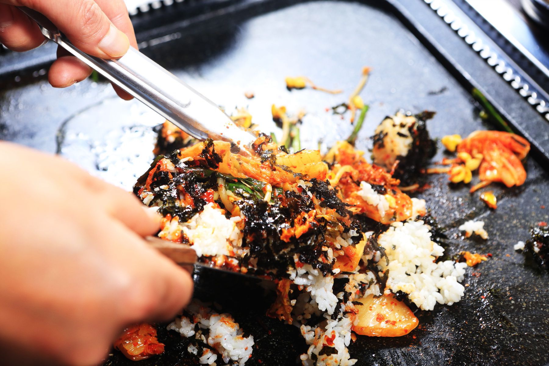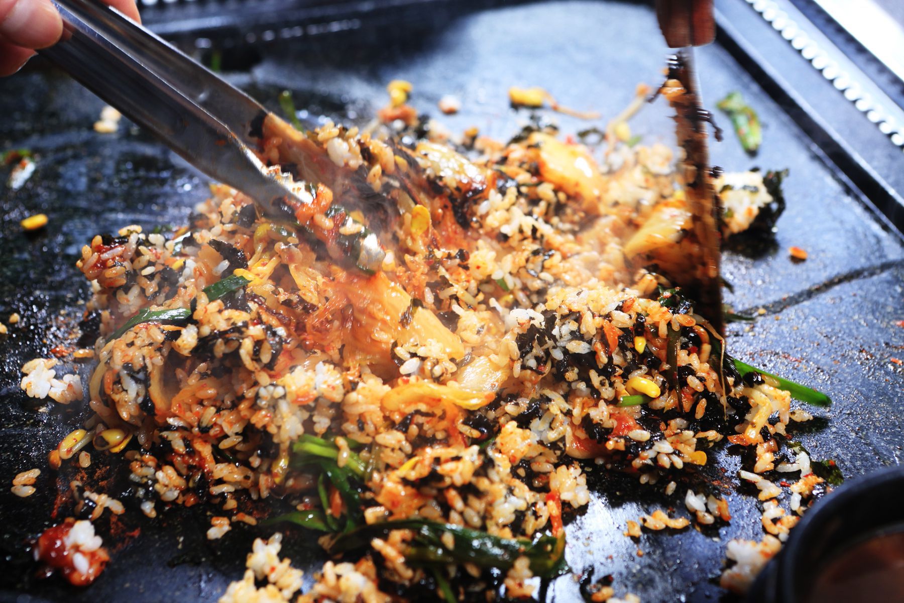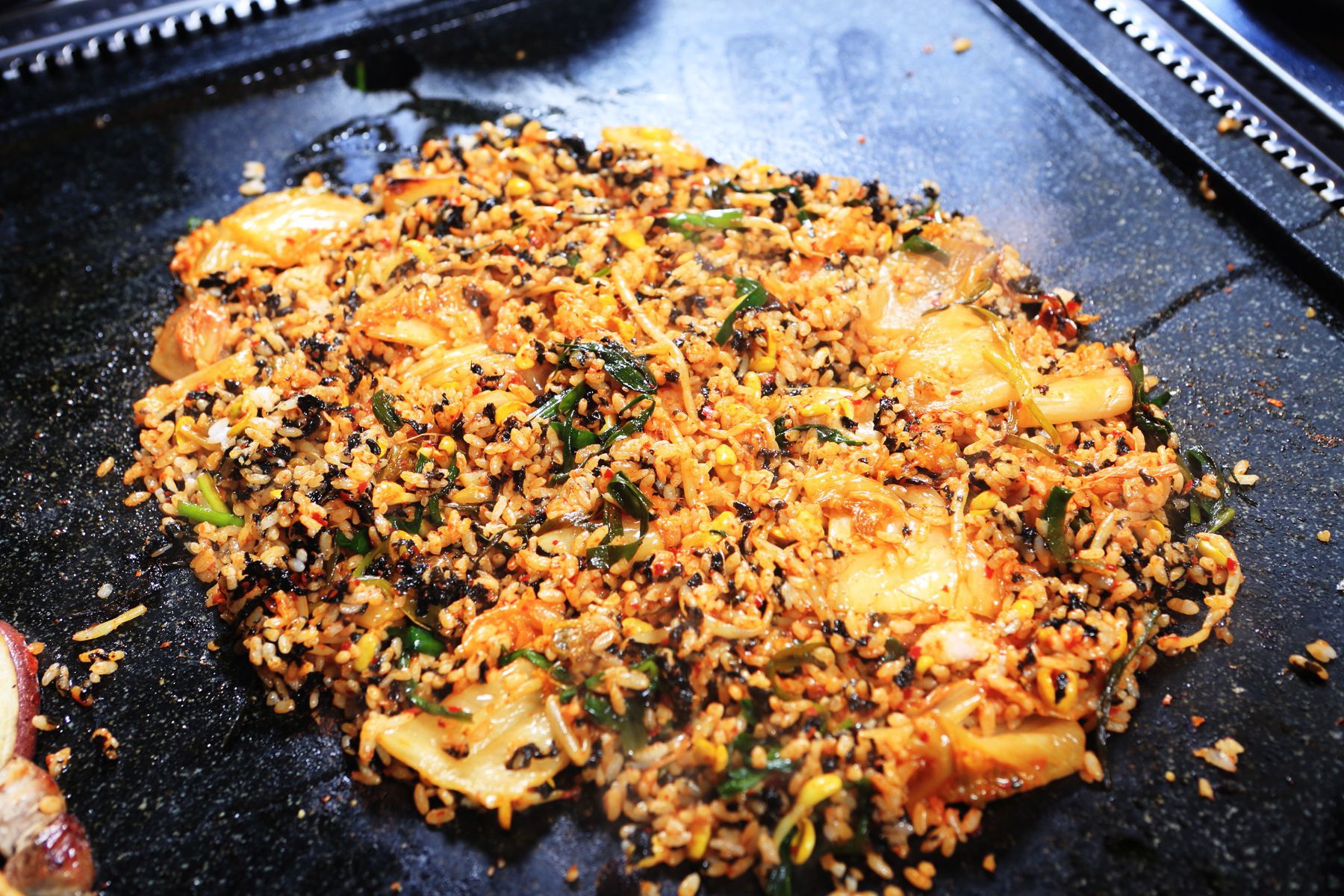 김치, 콩나물, 부추, 김가루와 함께 비벼먹는 볶음밥도 별미입니다.