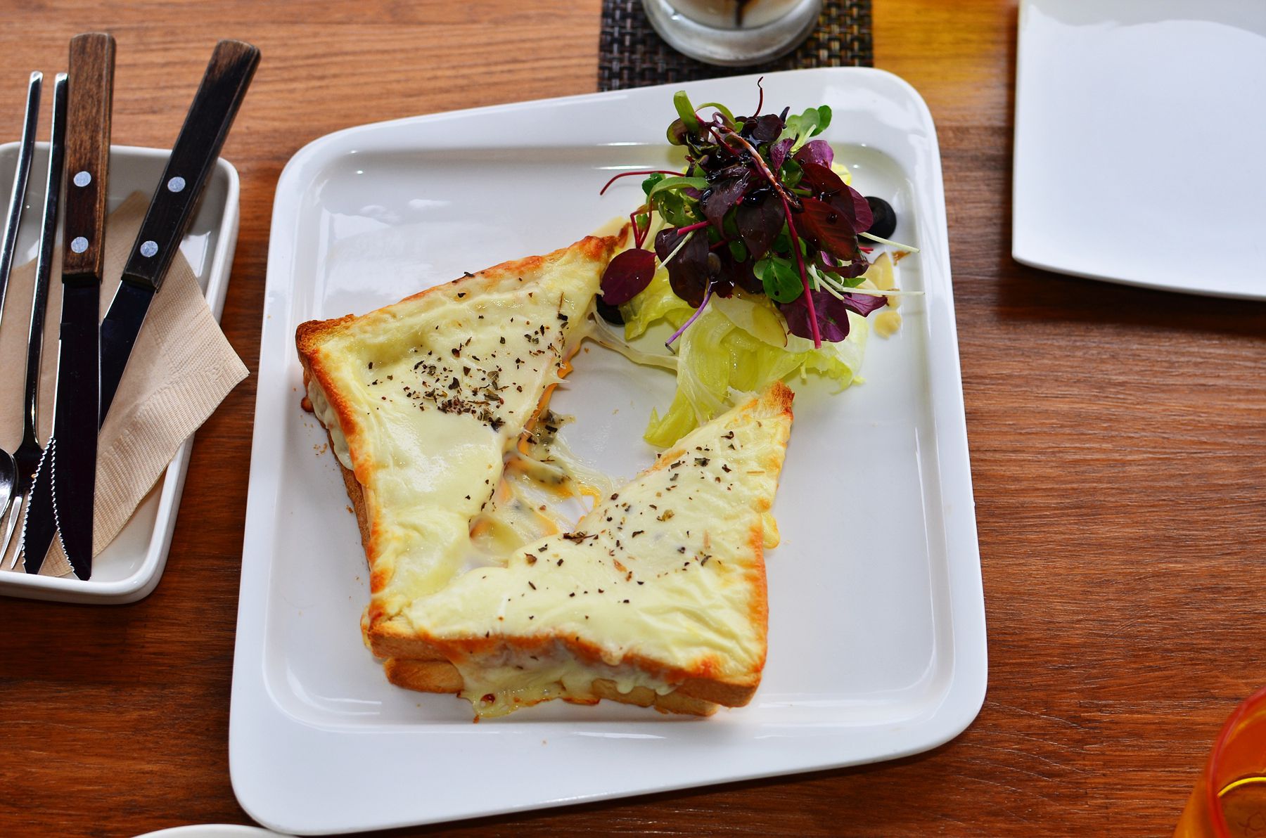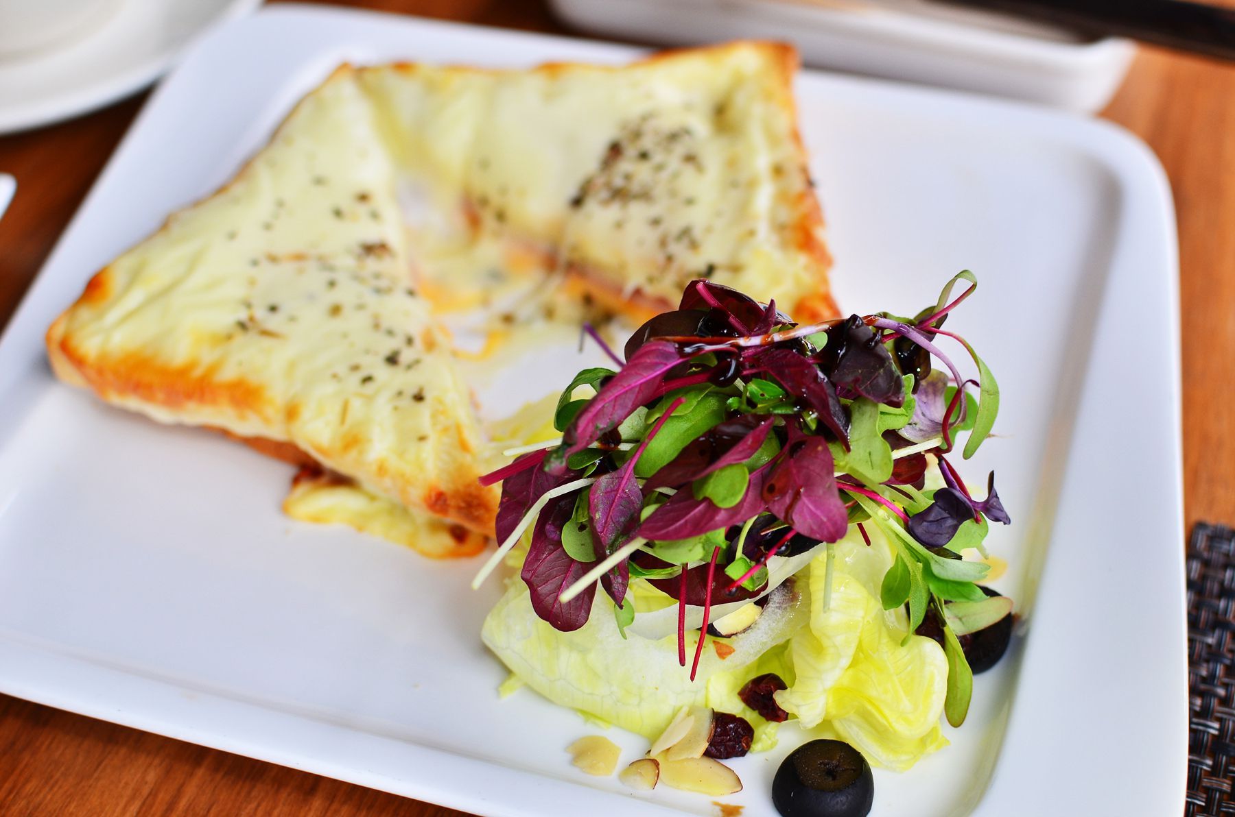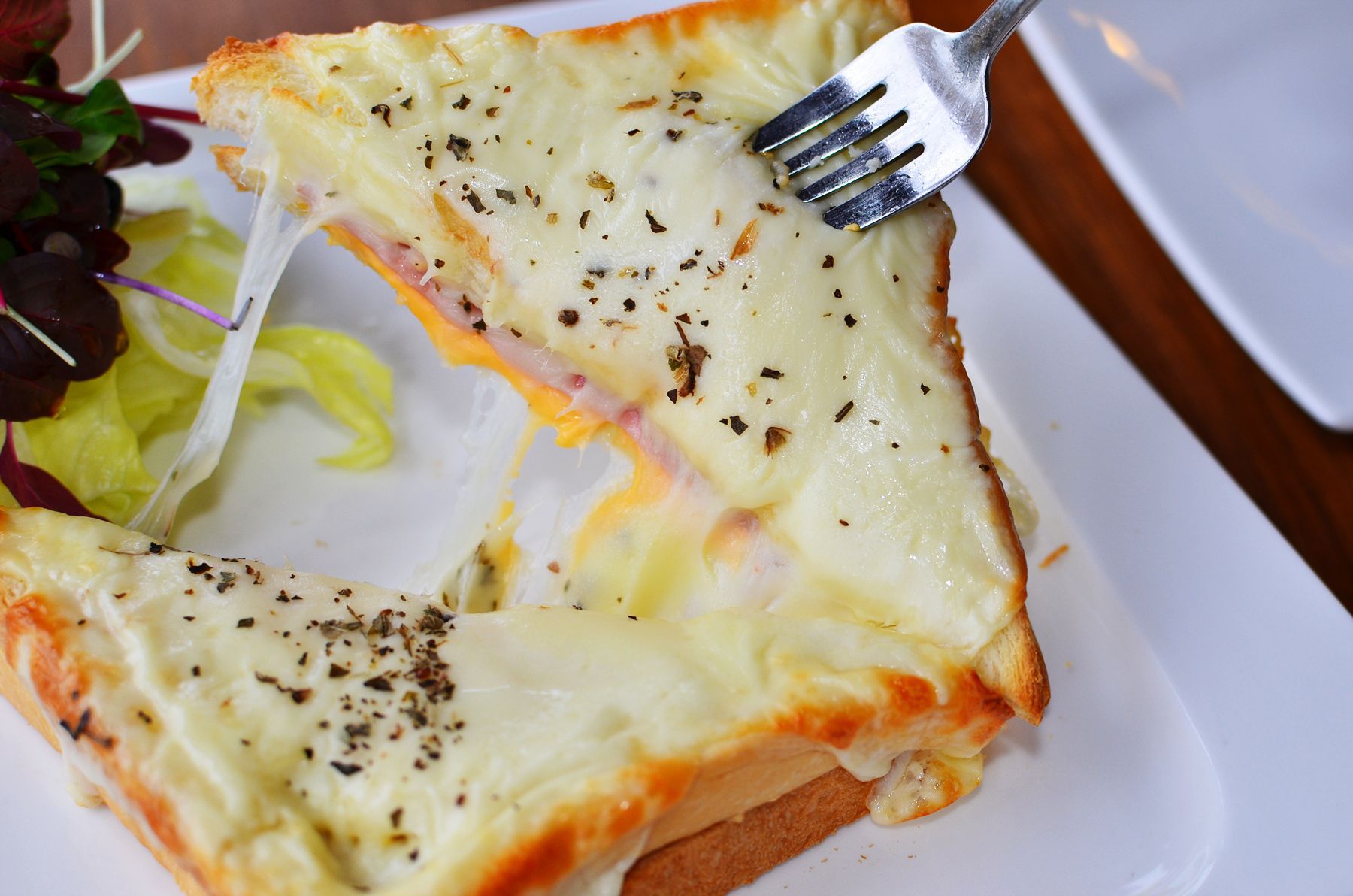 직접 만든 베사벨소스와 햄이 들어간 빵위에 모짜렐라 치즈가 가득한 프랑스식 샌드위치로