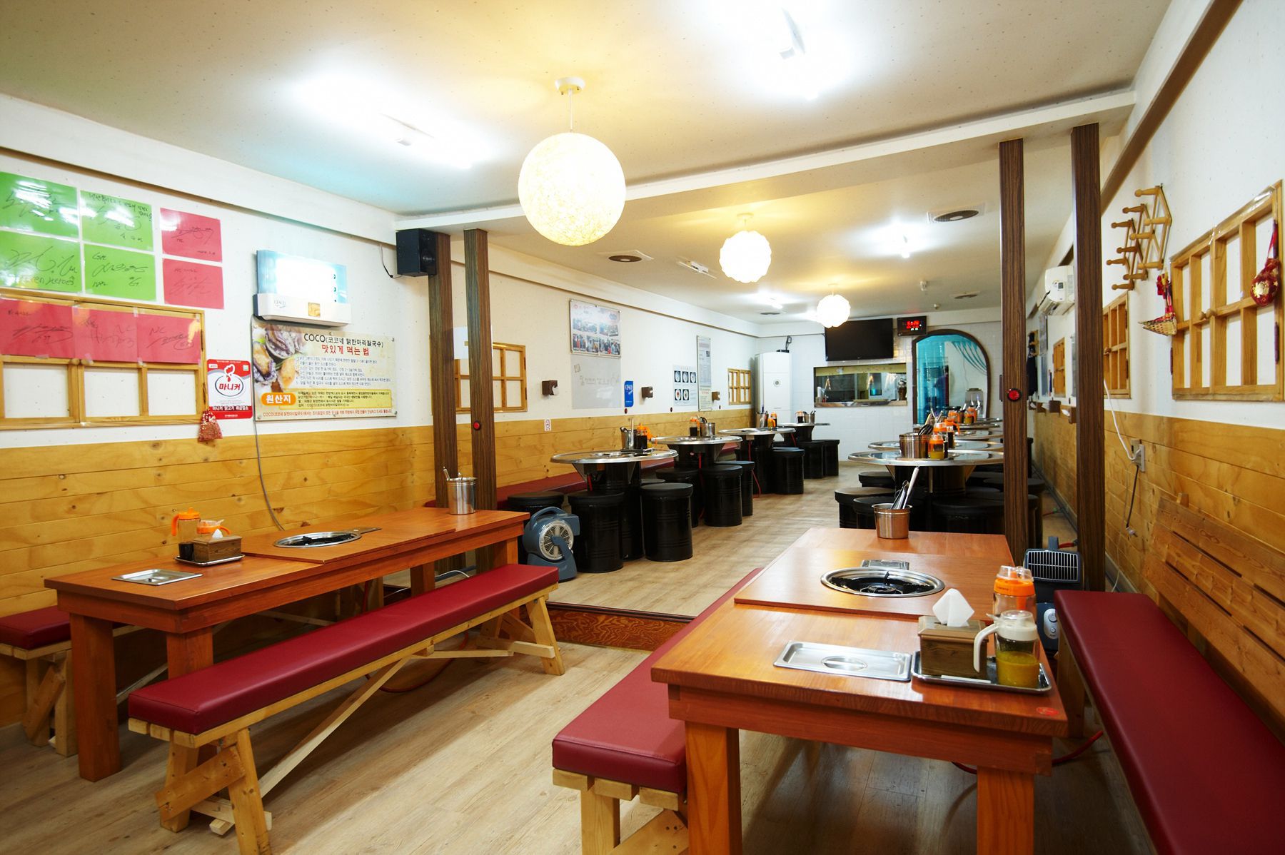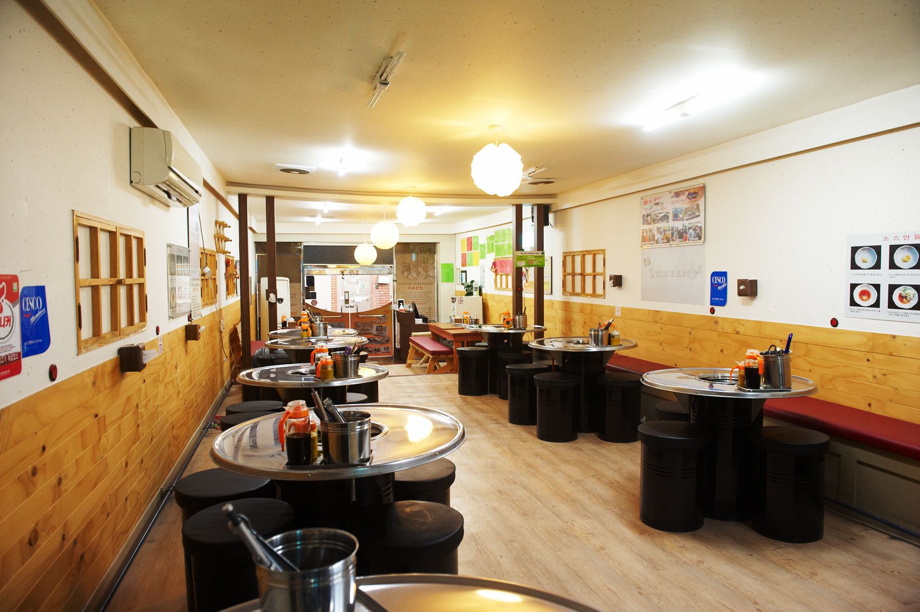 깔끔한 식당내부와 귀염돋는 동글동글한 테이블과 의자,거기다가 한쪽벽면에는