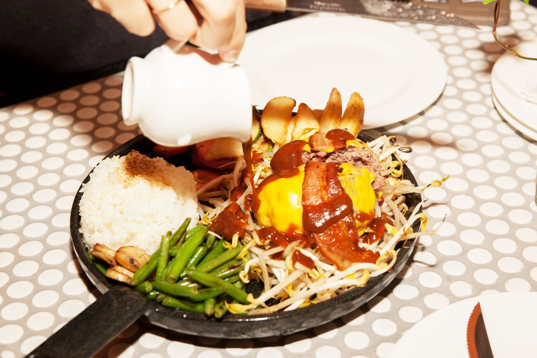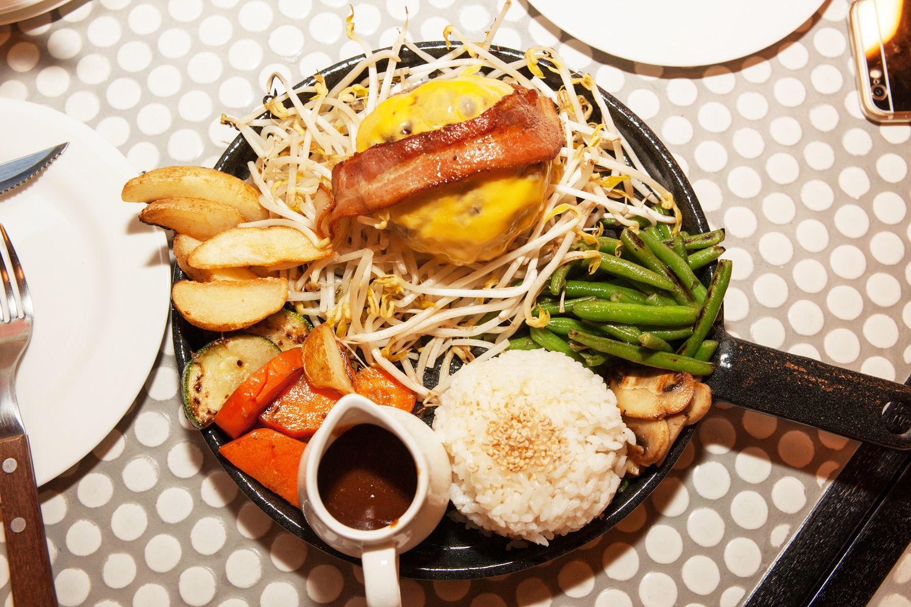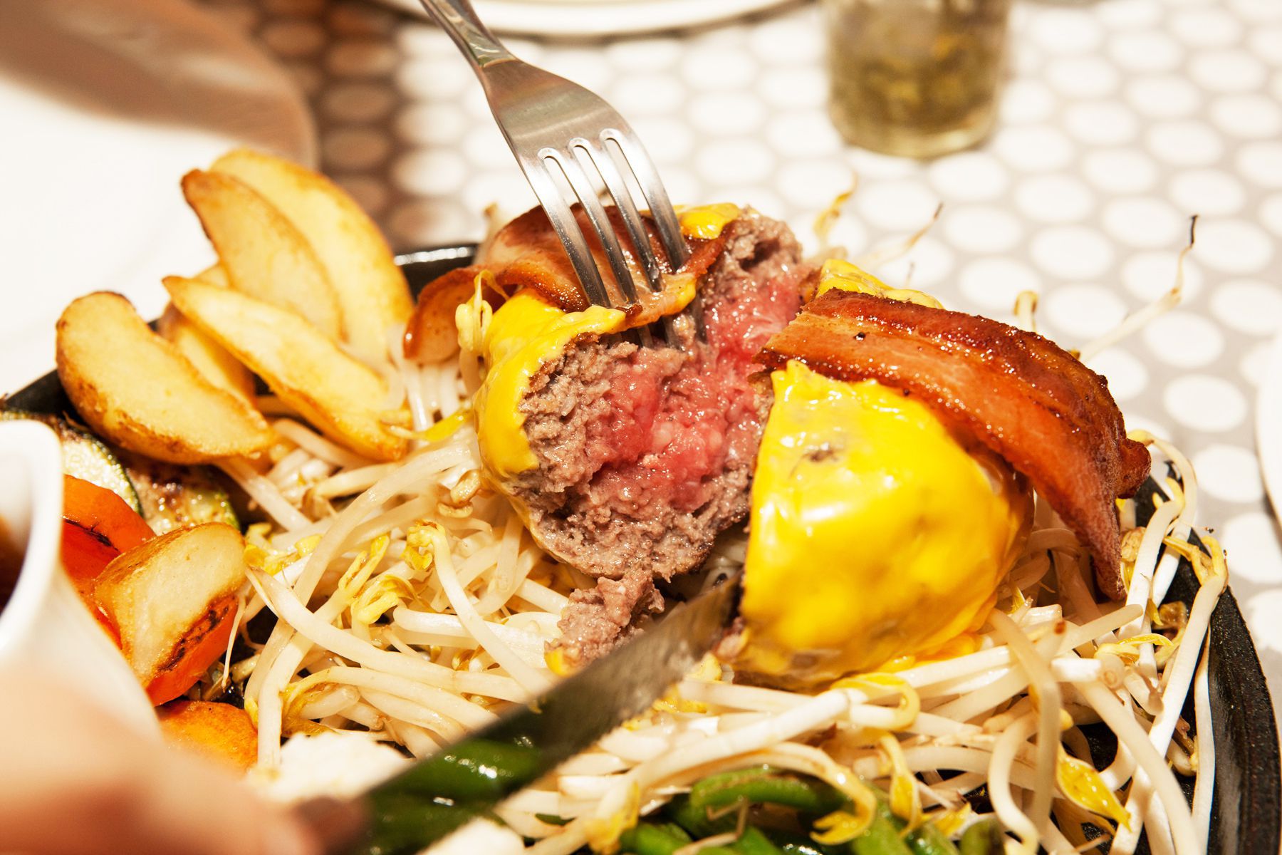 부드럽고 식감 좋은 함박스테이크에 치즈와 베이컨이 함께 있어 더욱 풍미가 좋습니다.