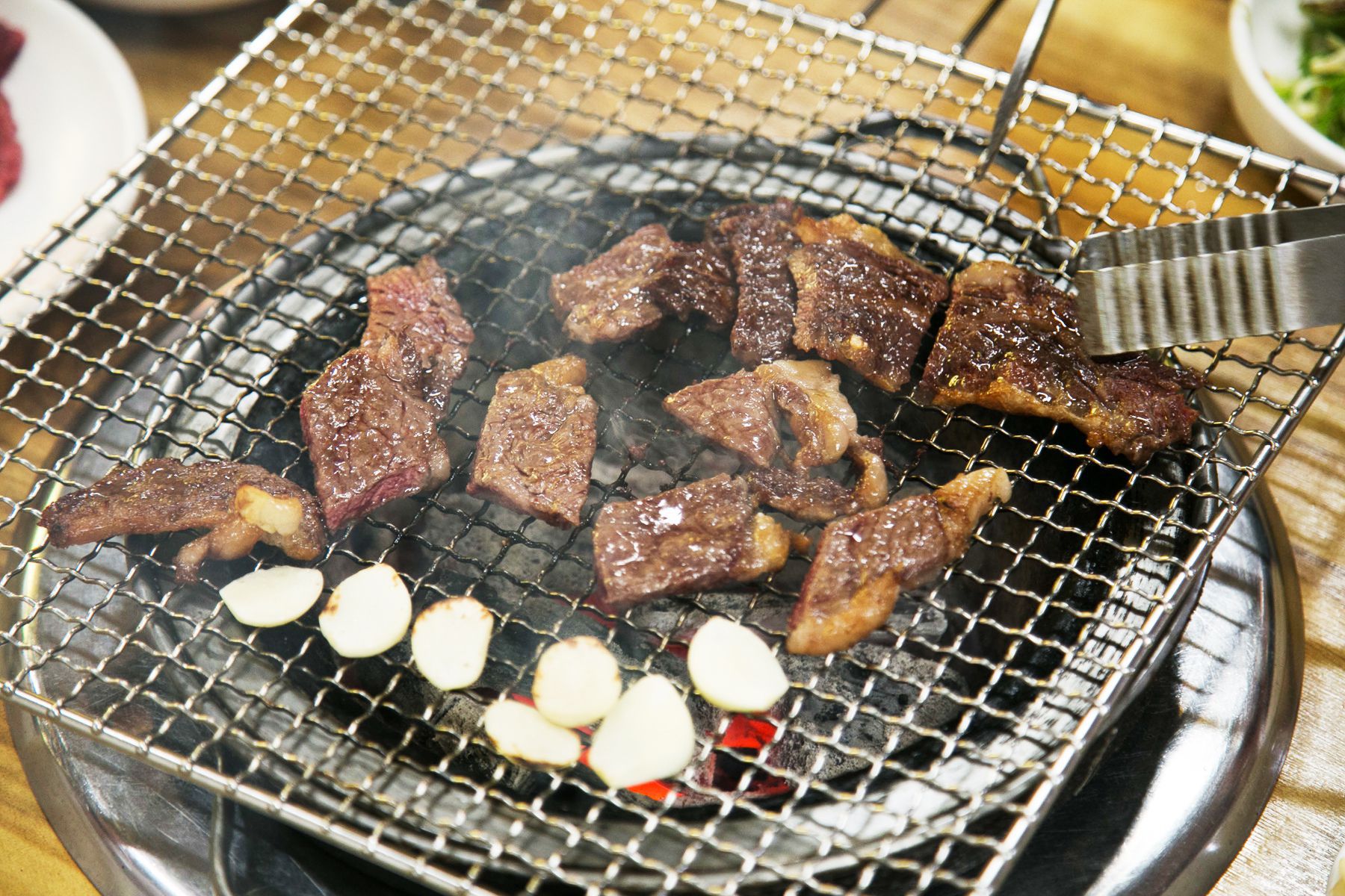 숯불에 잘 구워진 갈비살은 고소하고 육즙이 풍부하며 씹을수록 고소한 맛입니다.