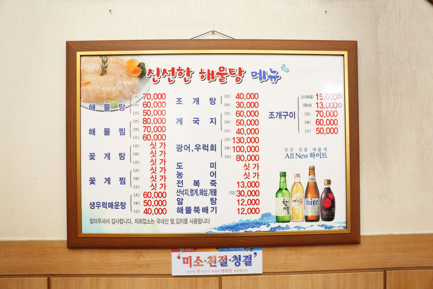 서해바다의 맛을 듬뿍 담고 있는 메뉴판에는 푸짐한 해산물 요리 가득합니다.
