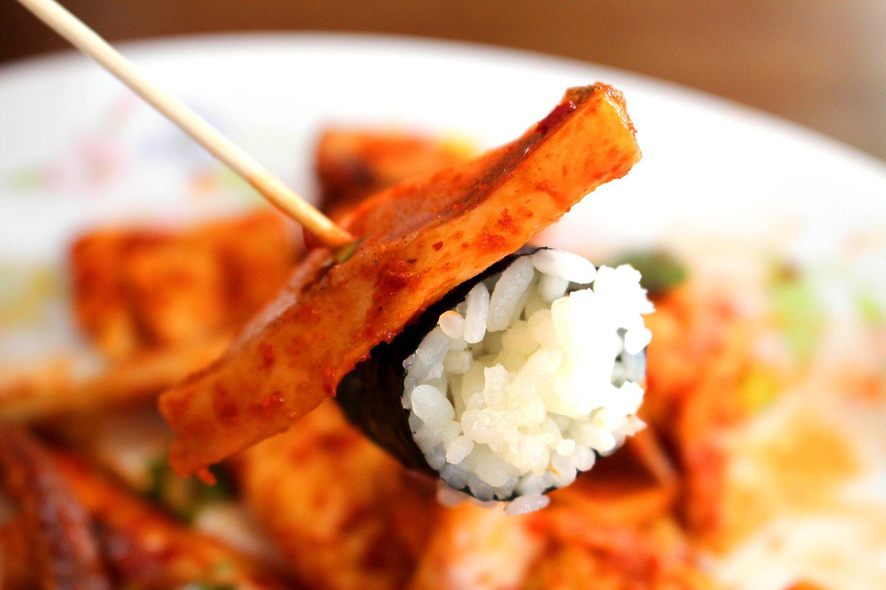 일반 김밥과는 달리 잘 상하지 않아 어부들의 점심으로 해결하게 된 데에서 유래된 향토음식으로