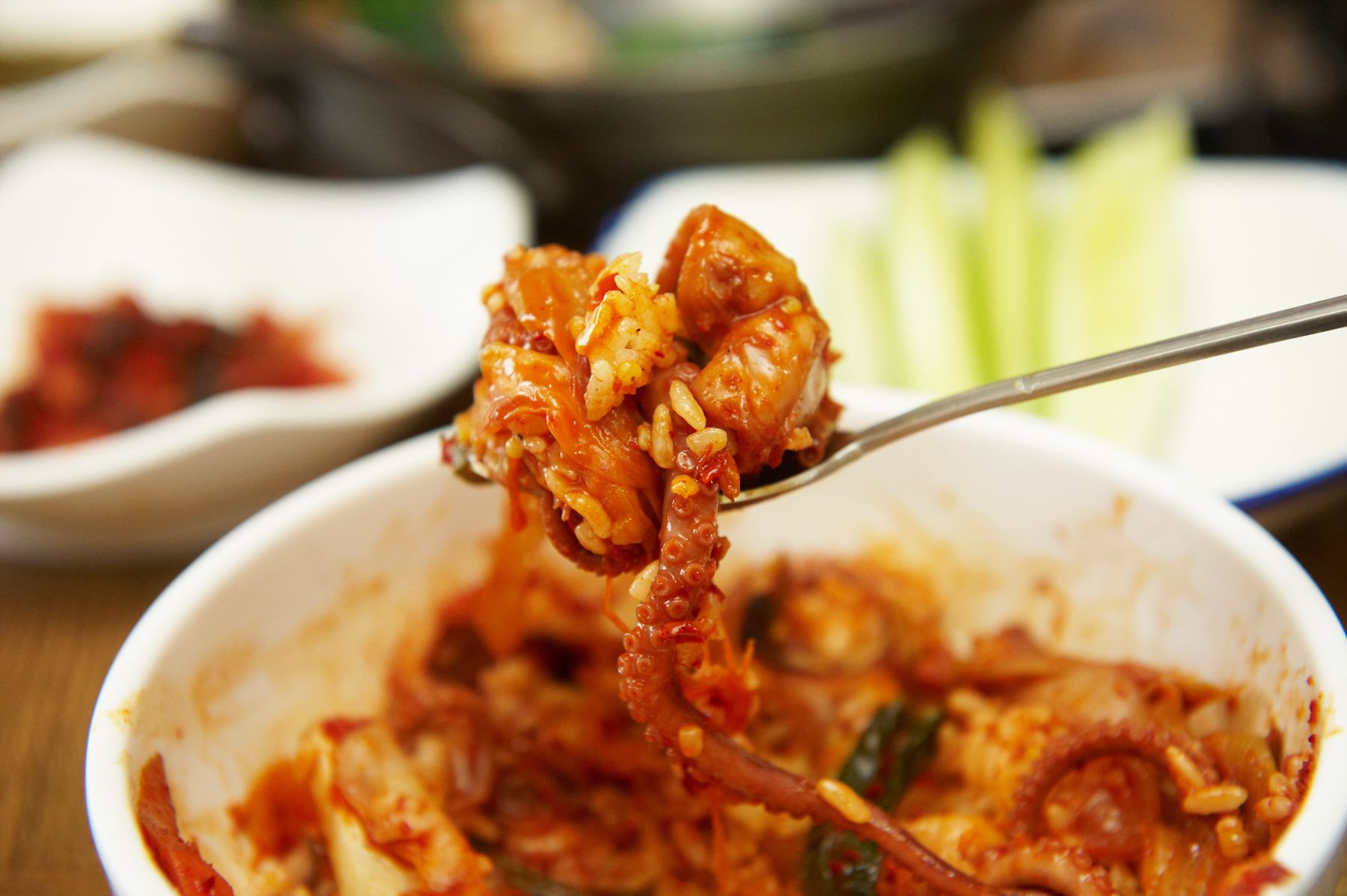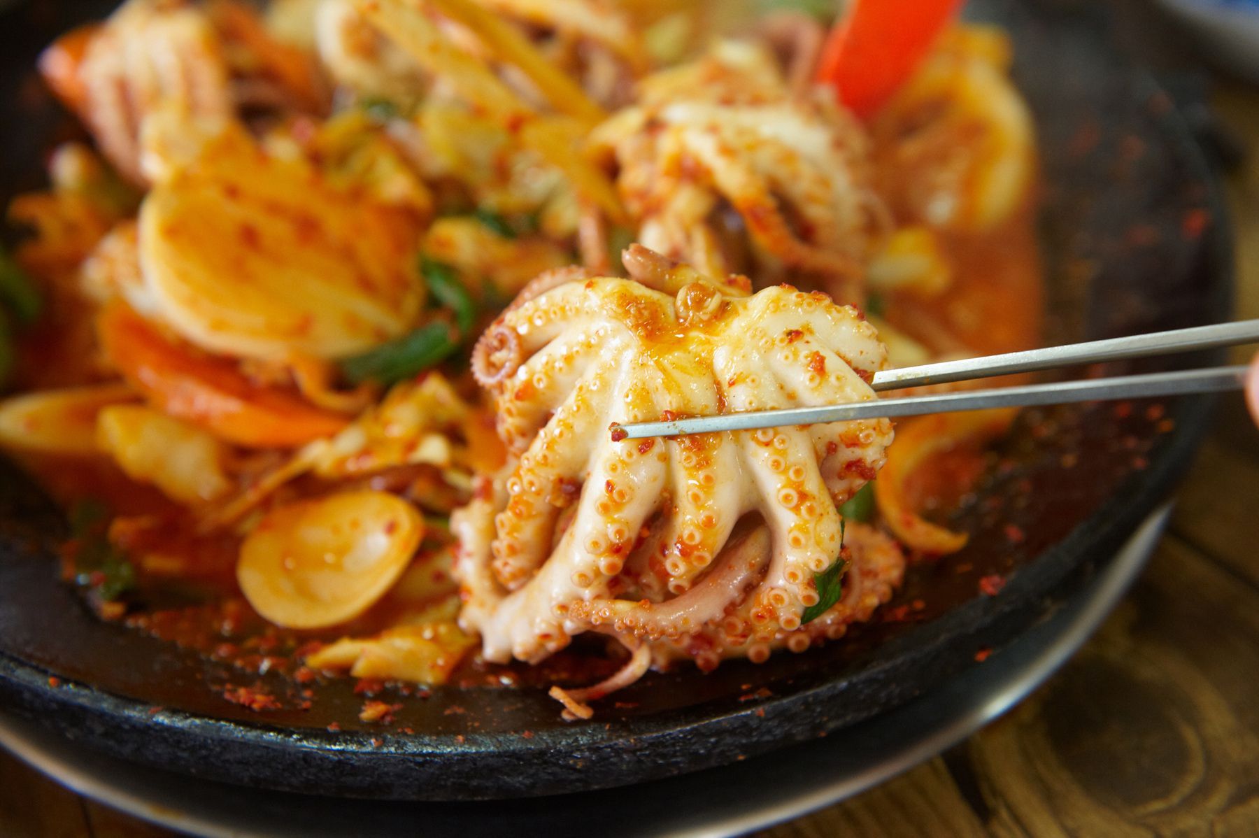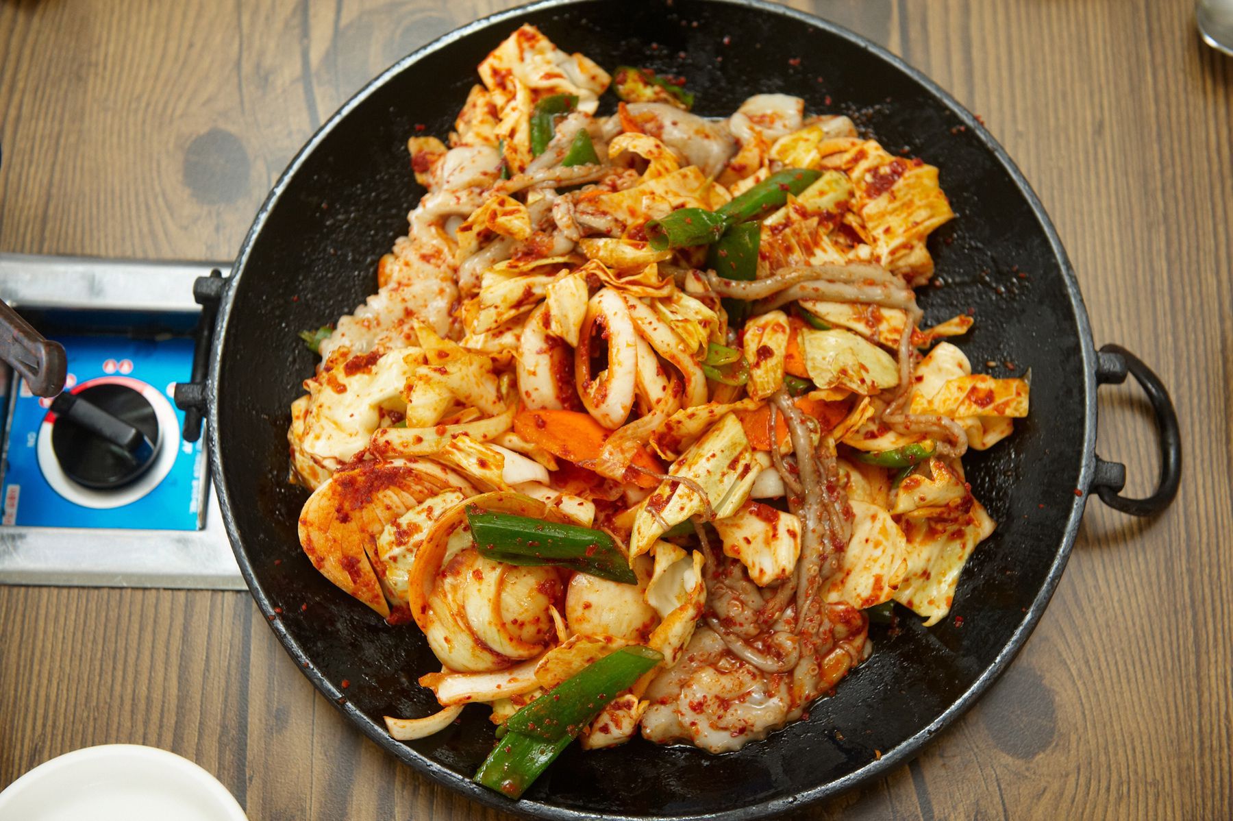 오동통하게 살이 차오른 낙지와 각종 채소를 매콤한 양념에 함께 버무려 익혀내며